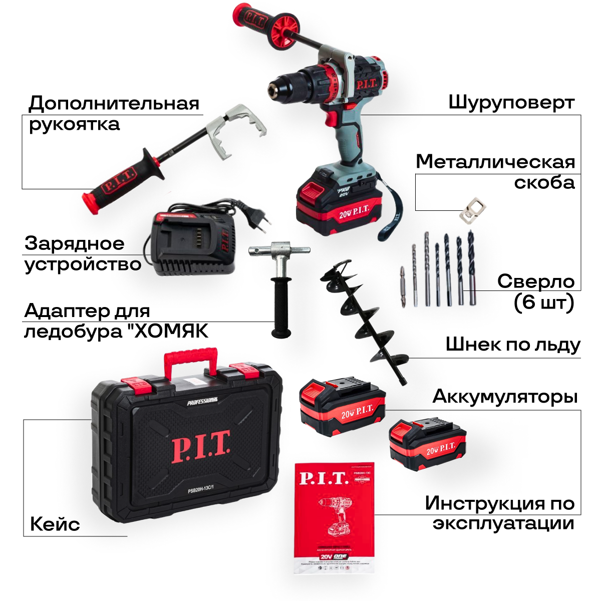 Шуруповерт для зимней рыбалки аккумуляторный бесщеточный PSB20H-13C/1 P.I.T., кейс, З/У, 2 АКБ 4Ач, адаптер для ледобура, шнек по льду 180мм