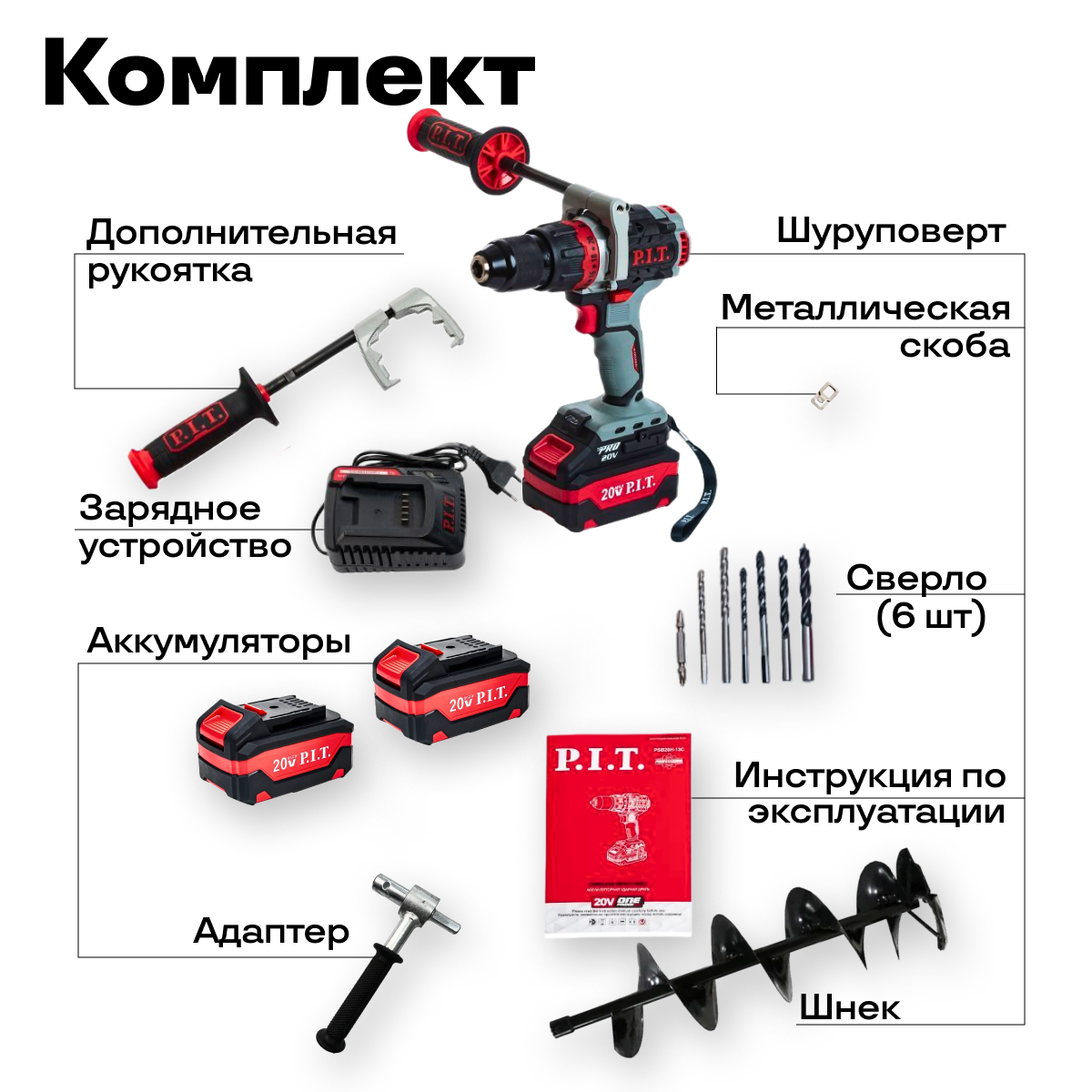 Шуруповерт для зимней рыбалки аккумуляторный бесщеточный PSB20H-13C/1 P.I.T, кейс, З/У, АКБ 4Ач + доп. АКБ 2Ач + адаптер для ледобура + шнек 180 мм