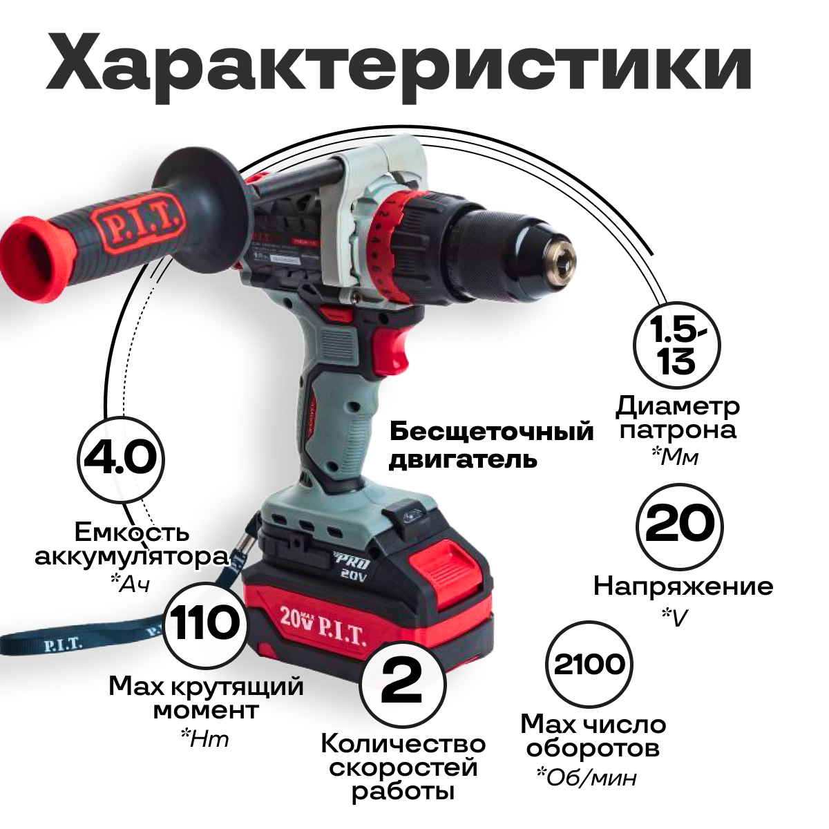 Шуруповерт аккумуляторный бесщеточный PSB20H-13C/1 P.I.T., кейс, З/У, АКБ 4Ач + доп. АКБ 4Ач