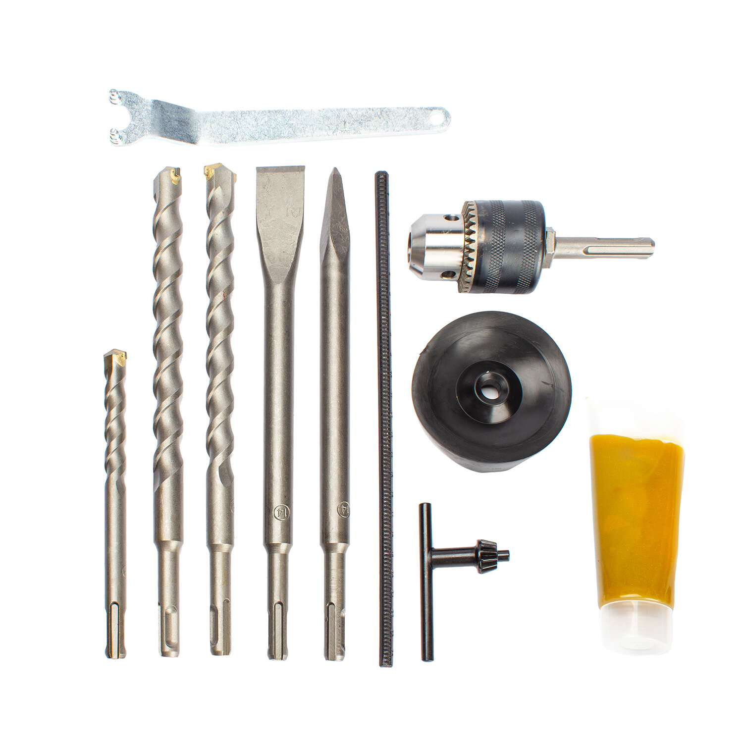 | Комплектация | Перфоратор, патрон ЗВП (1,5-13 мм) с адаптером SDS plus, ключ к патрону ЗВП, ограничитель глубины сверления, дополнительная рукоятка, инструкция по эксплуатации, бур SDS plus (12х160; 16х250; 18х250 мм) - 3шт, пика 250мм, зубило 14х250мм, пыльник патрона, специальный ключ, тюбик со смазкой, пластиковый кейс |
