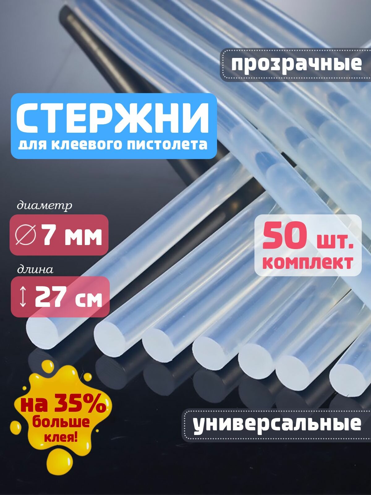 Клеевые стержни для клеевого пистолета 7 мм х 270 мм, термоклей, прозрачные 100 штук.