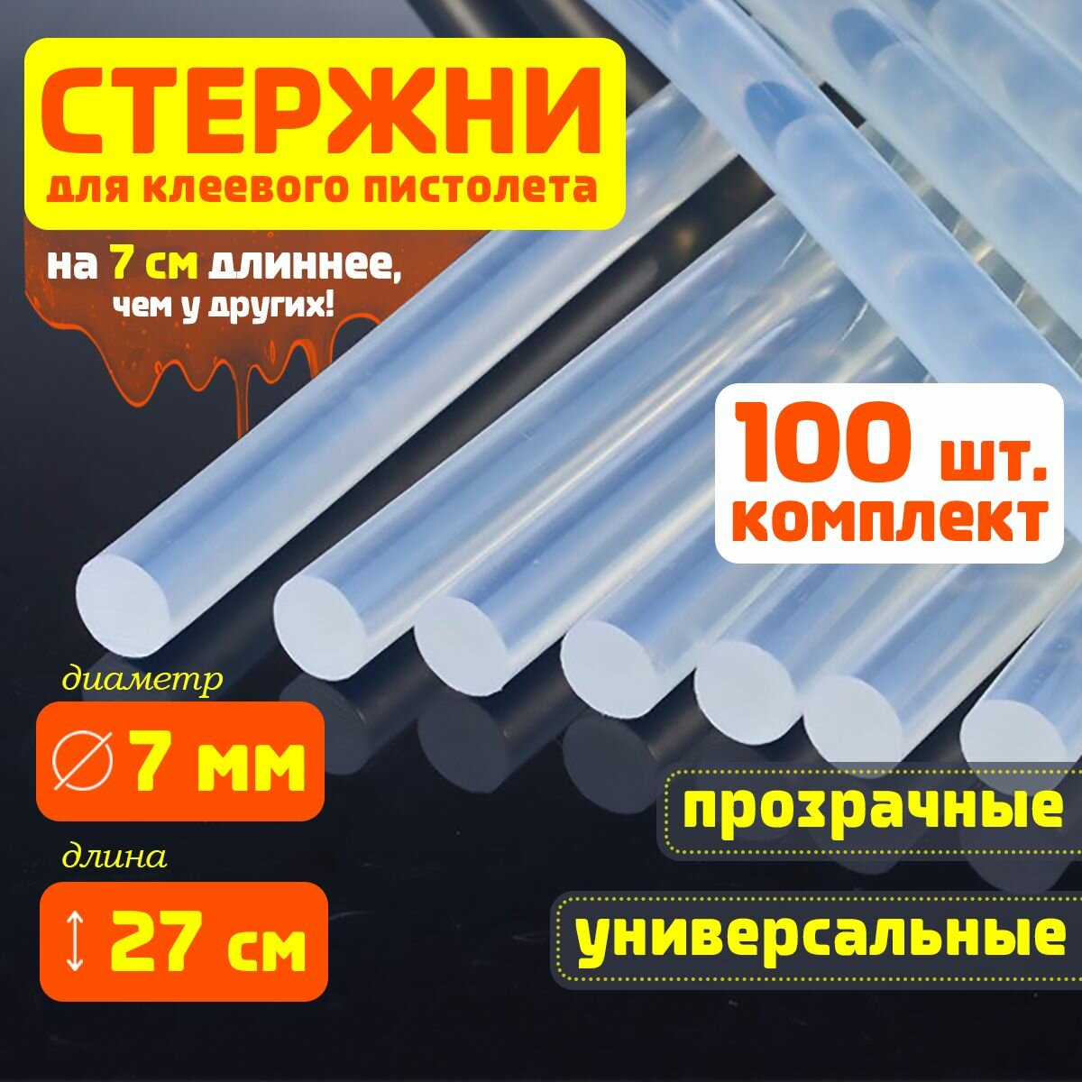 Купить Клеевые стержни для клеевого пистолета 7 мм х 270 мм, термоклей, прозрачные 100 штук.