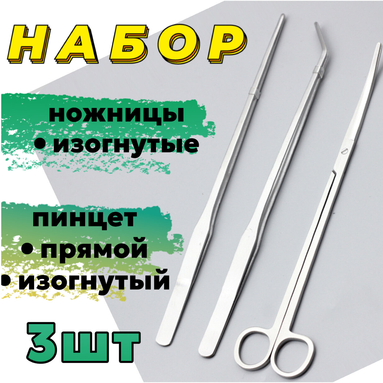 Купить Набор для ухода за живыми растениями / пинцет прямой 27 см + изогнутый 26.5 / ножницы изогнутые 25 см для в аквариума, флорариума