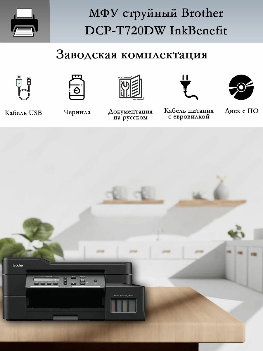 МФУ струйный Brother DCP-T720DW, СНПЧ, с Wi-fi, стартовый набор картриджей, кабель USB интересное: