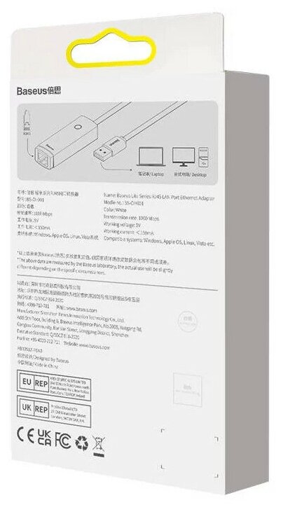| Дополнительная информация | Адаптер-переходник Baseus Lite Series Ethernet Adapter USB-A to RJ45 LAN Port (1000Mbps) White (WKQX000102) |