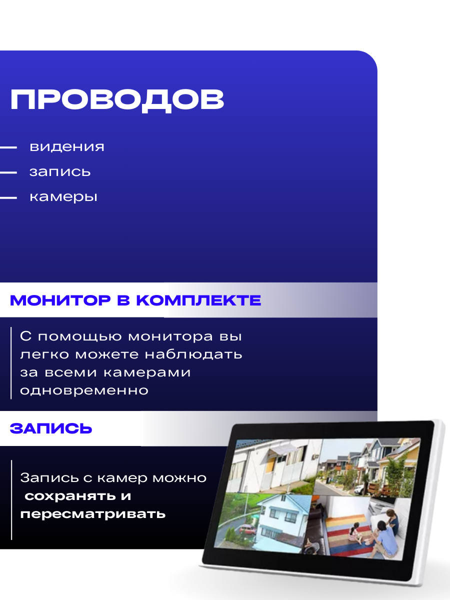 | Подробная комплектация | 4 камеры, монитор, мышь, инструкция, комплект зарядок |