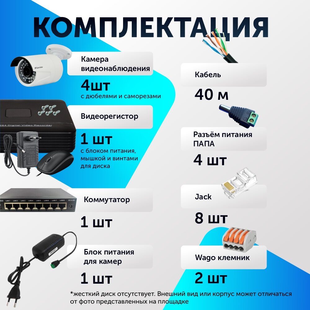 | Подробная комплектация | Видеорегистратор 4 канальный 1 шт; 2 Мп цилиндрическая IP камера 3 шт; Коммутатор 1 шт; Блок питания 3А для камер 1 шт; Коннекторы (джек) RJ-45 6 шт; Разъем питания 3 шт; Клеммы 2 шт; Блок питания 2А для видеорегистратора 1 шт; Кабель видеонаблюдения 30 метров; Инструкция на русском языке; Проводная мышь 1 шт. |