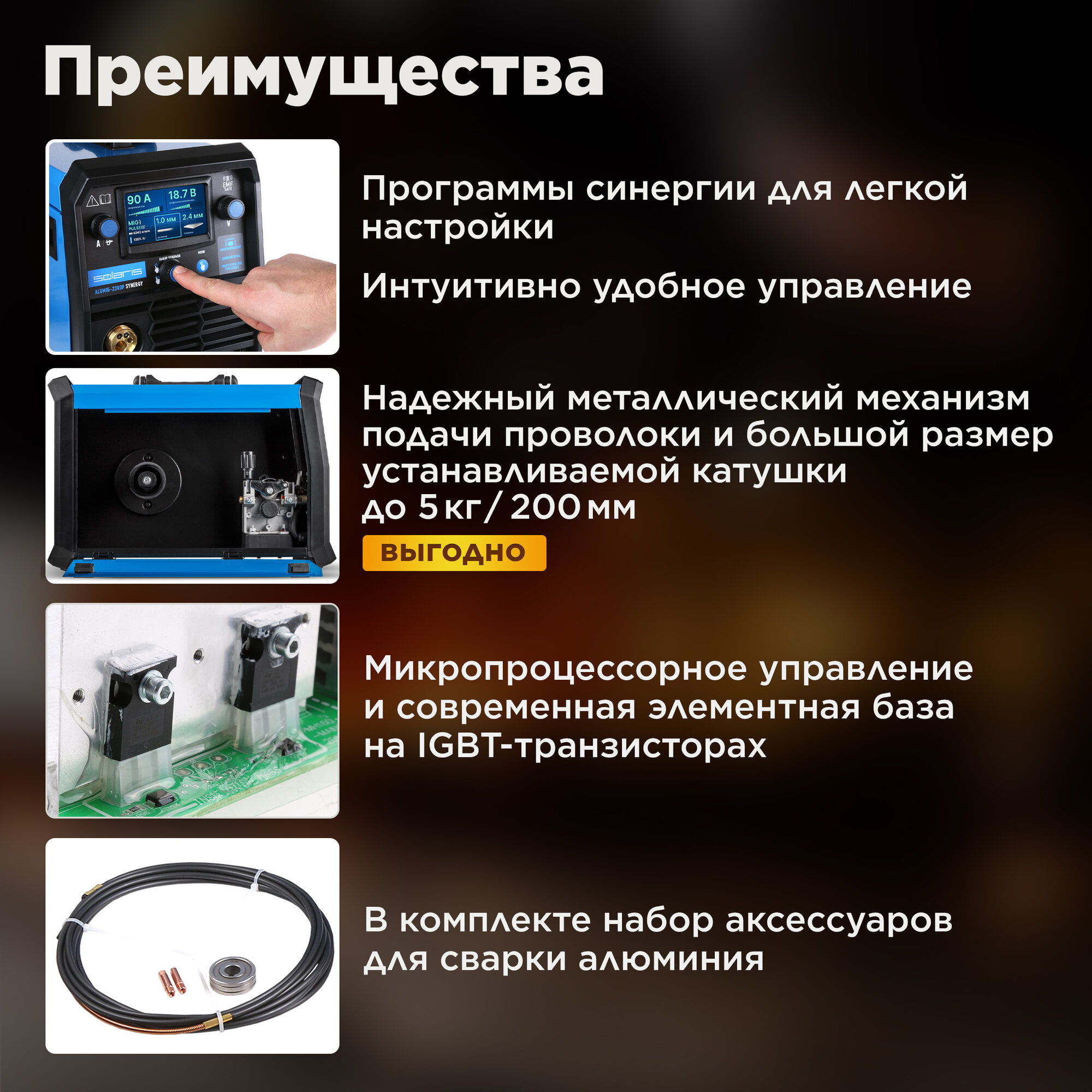 Полуавтомат сварочный 9 в 1 с газом и без газа сварка алюминия Solaris ALUMIG-230DP SYNERGY интересное: