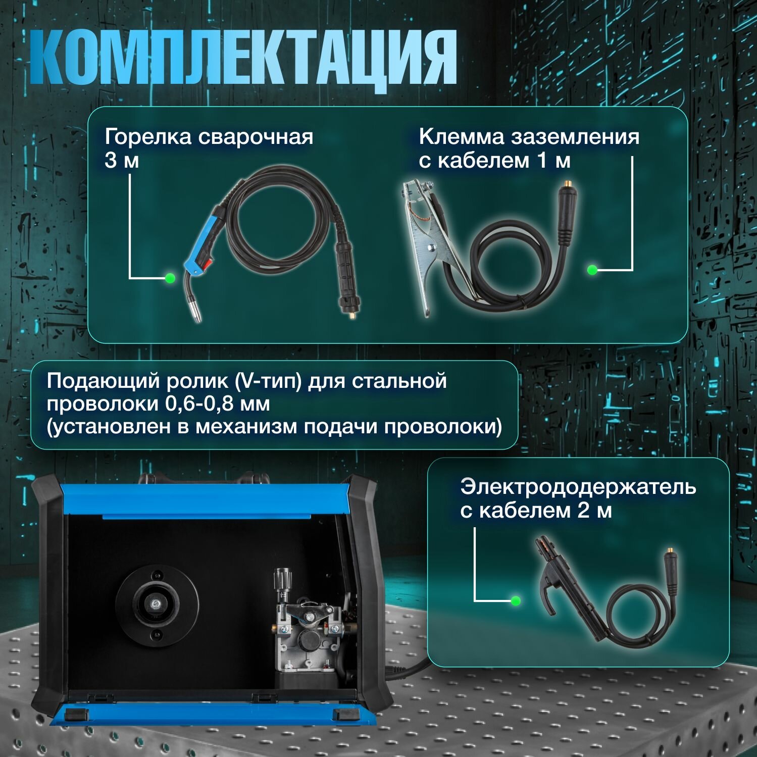 | Комплектация | Инверторный полуавтомат; Горелка сварочная MIG 3 метра; Электрододержатель с кабелем 2 метра; Клемма заземления с кабелем 1 метр; Подающий ролик (V-тип) для стальной проволоки 0,6-0,8 мм (установлен в механизм подачи проволоки); Подающий ролик (U-тип) для алюминиевой проволоки 0,8-1,0 мм; Подающий ролик (K-тип) для порошковой флюсовой проволоки 0,8-1,0 мм; Контактные наконечники: 0.8 мм (1 шт., установлен на горелку); 0,6 мм (1 шт.); 0,8 мм (1 шт.); 1,0 мм (1 шт.); Контактные наконечники для алюминия: 0,8 мм (1 шт.); 1,0 мм (1 шт.); Щетка для удаления шлака; Тефлоновый канал для подачи алюминиевой проволоки, Инструкция. |