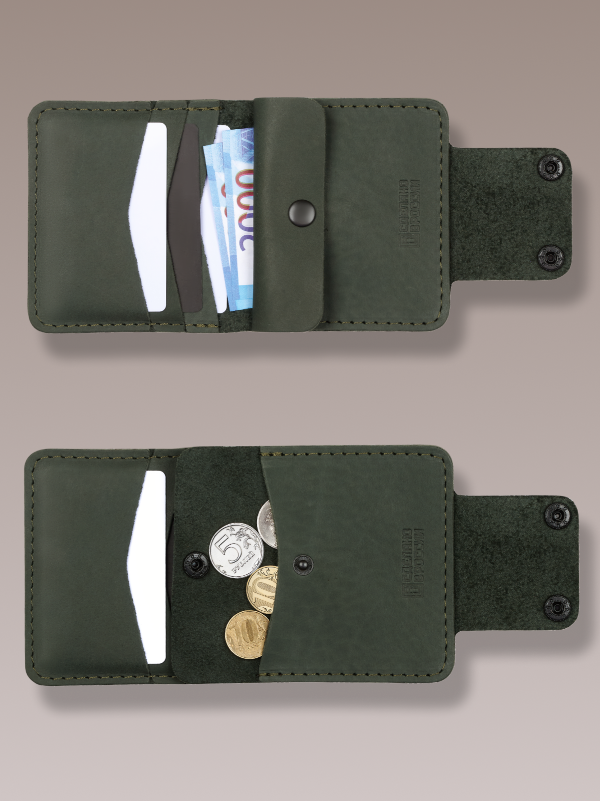 Кожаный кошелек для карт, картхолдер с монетницей на кнопках, зеленый интересное: