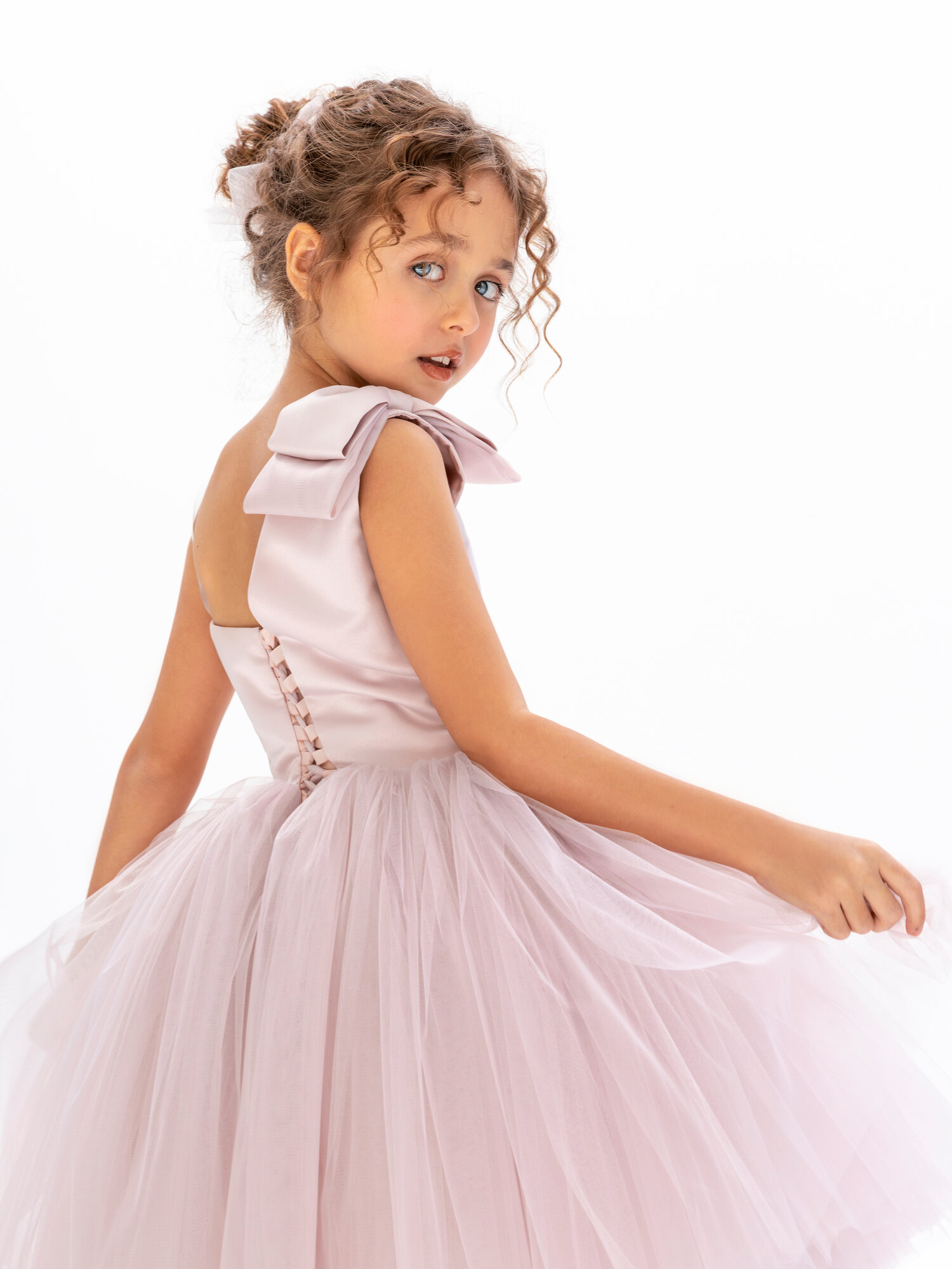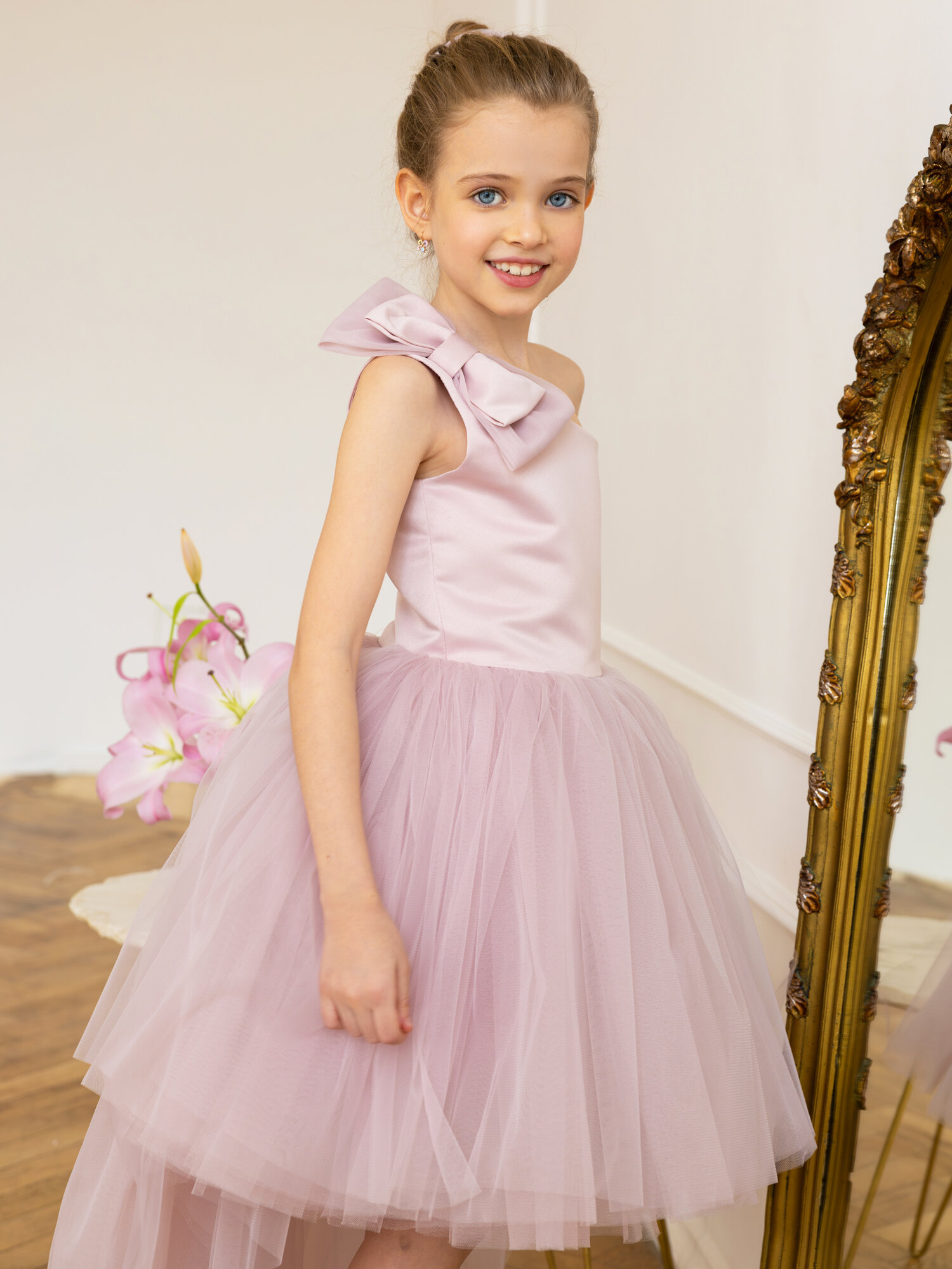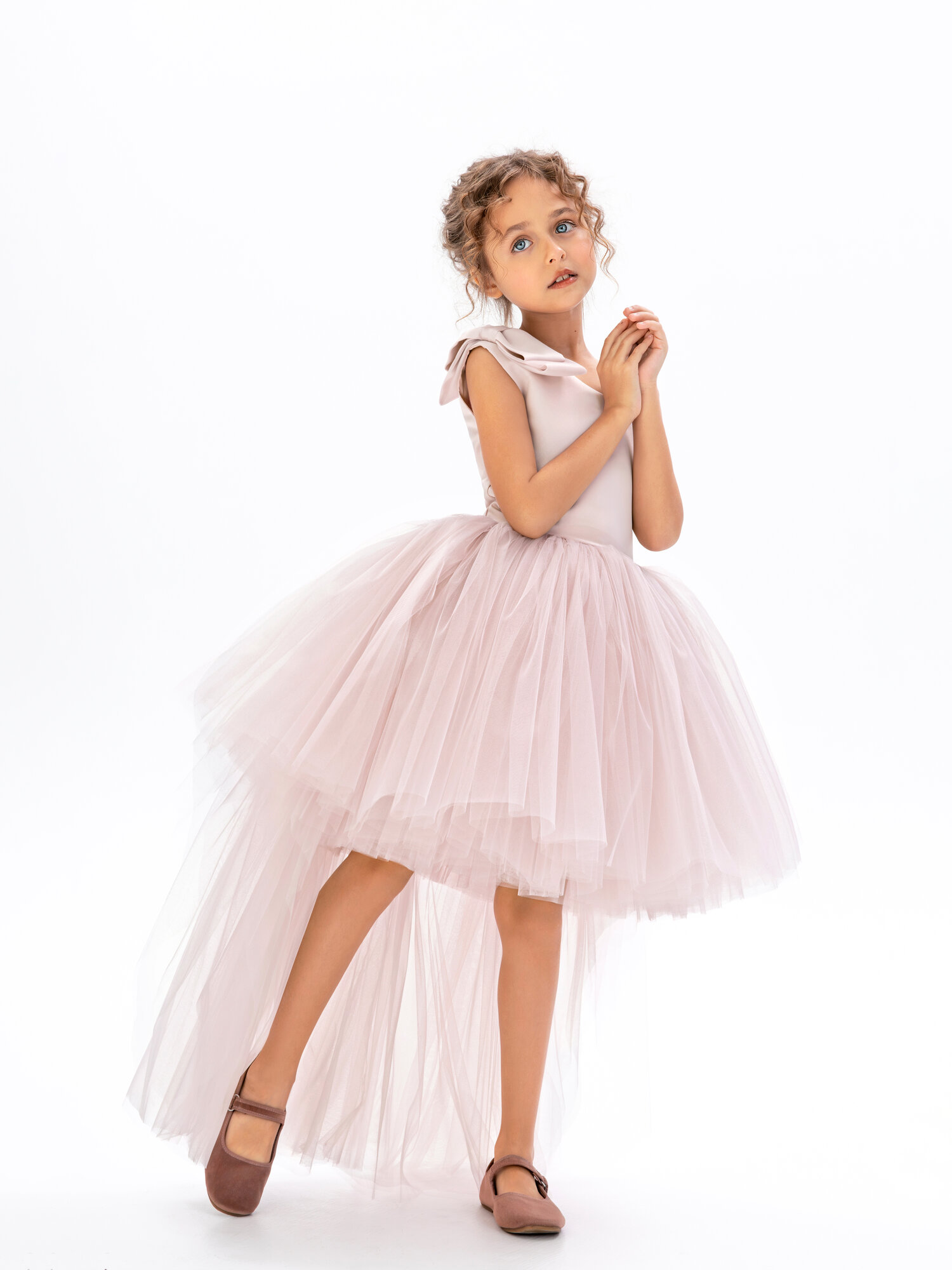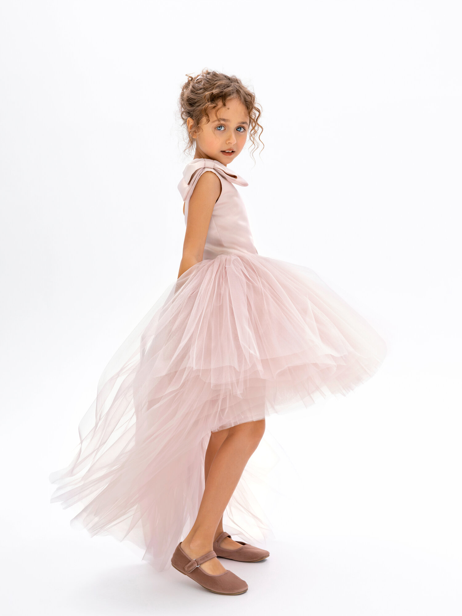 СохранитьПудровое платье Канны 116 см нарядное с бантом и шлейфом интересное:
