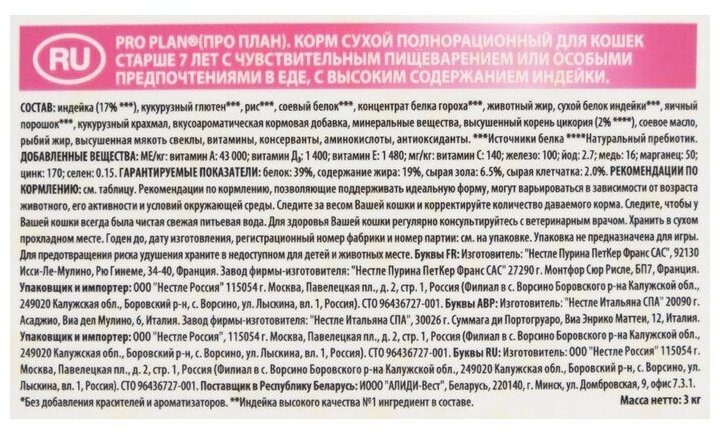 Pro Plan корм для пожилых кошек всех пород, чувствительное пищеварение, индейка 3 кг