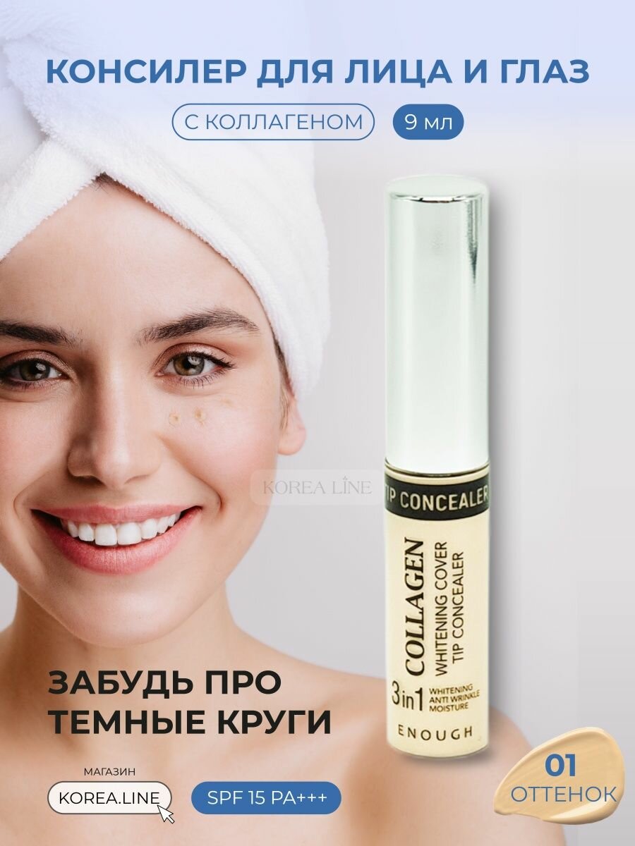 Купить Enough Консилер корректор осветляющий для лица глаз 3 в 1 Collagen Whitening Cover Tip Concealer 3 in 1 с морским коллагеном, тон № 01