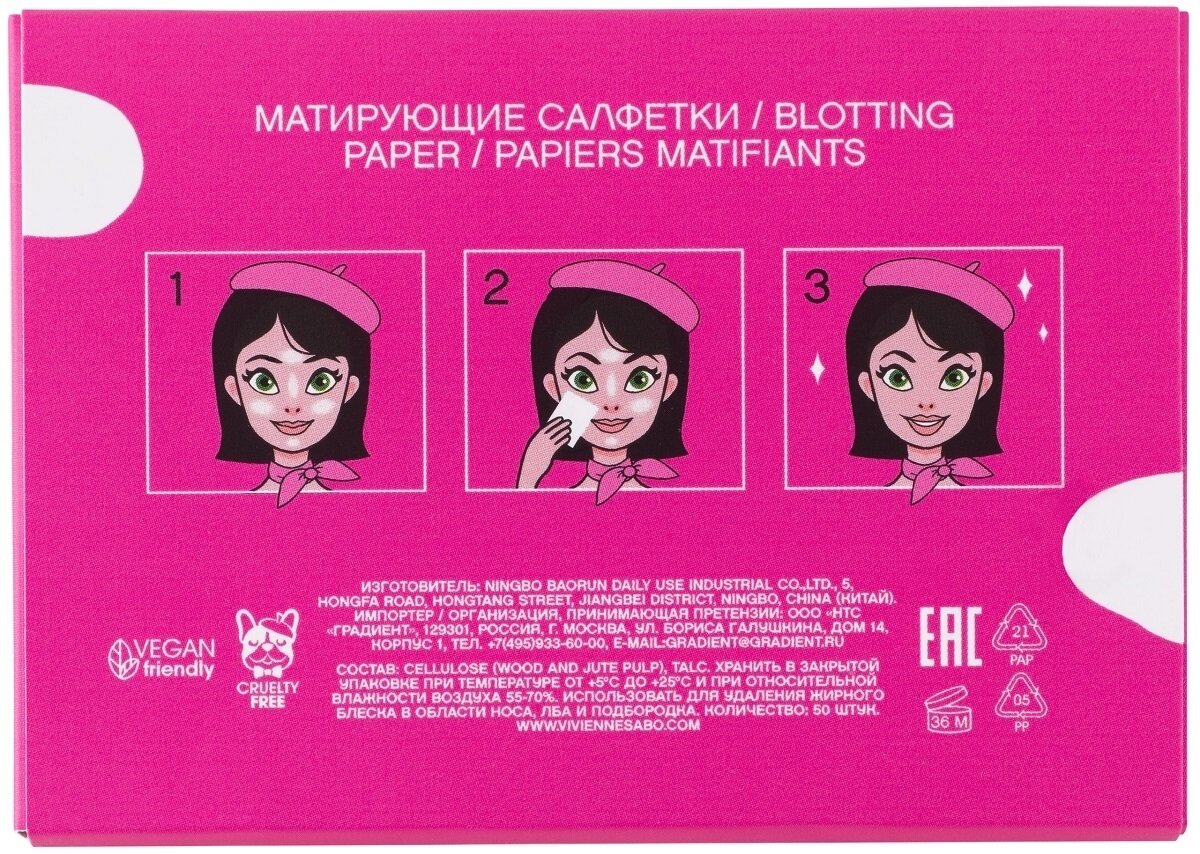 Ниже Вы можете прочитать отзывы на VIVIENNE SABO Матирующие салфетки Papier Matifiant, 50 шт, ознакомится с подробными характеристиками, посмотреть интересные обзоры и фотографии на VIVIENNE SABO Матирующие салфетки Papier Matifiant, 50 шт.
