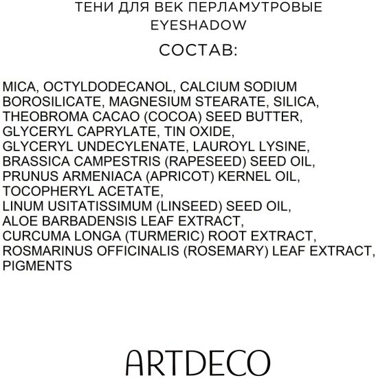 | Способ применения | перламутровые тени для век Eyeshadow Pearl от ARTDECO наносятся на чистую кожу век, используя аппликатор или кисть. Для получения наилучшего результата используйте базу (праймер) под тени |