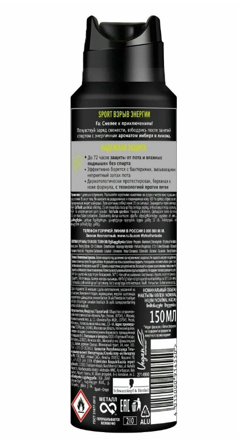 | Состав | butane, propane, cyclomethicone, aluminum chlorohydrate, isobutane, ethylhexyl, palmitate, isopropyl myristate, parfum, disteardimonium hectorite, triethyl citrate, propylene carbonate, linalool, limonene, hexyl cinnamal, sodium starch octenylsuccinate, 2-benzylheptanol, citronellol, phenoxyethanol, geraniol, coumarin, citral, amyl cinnamal |