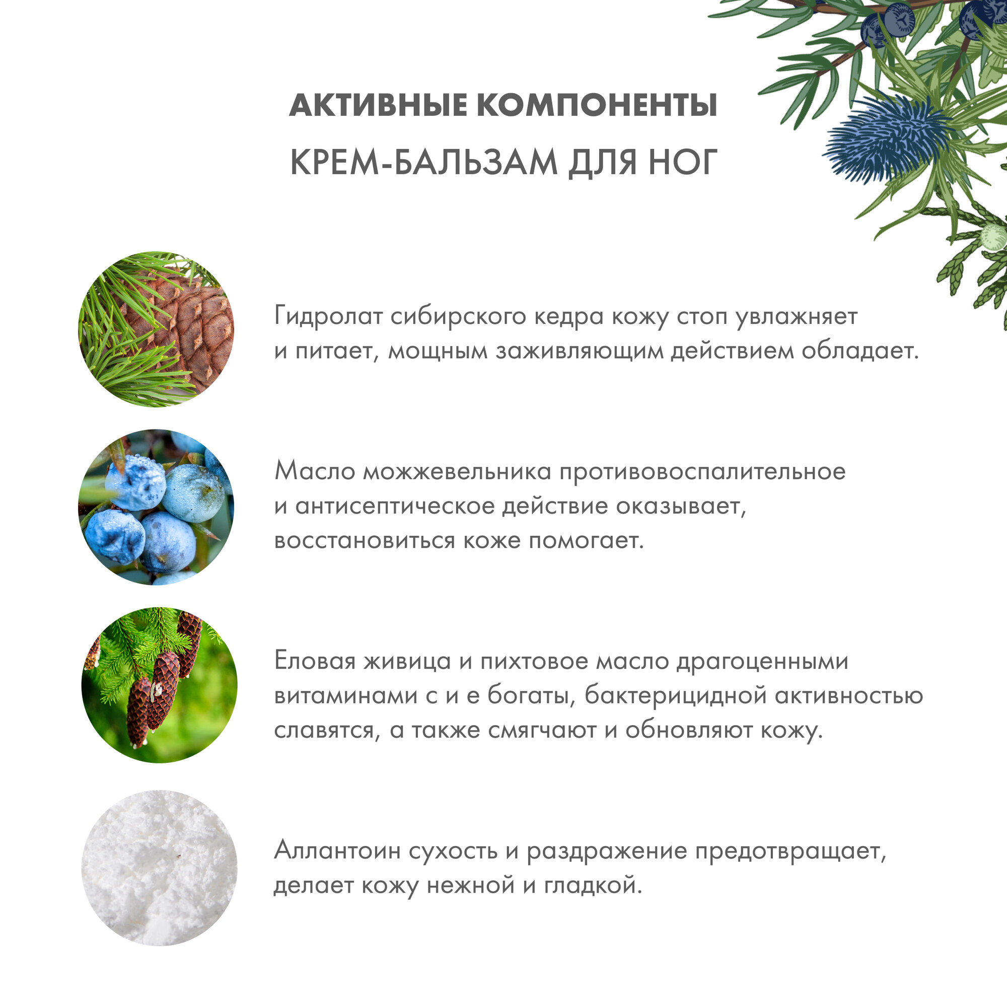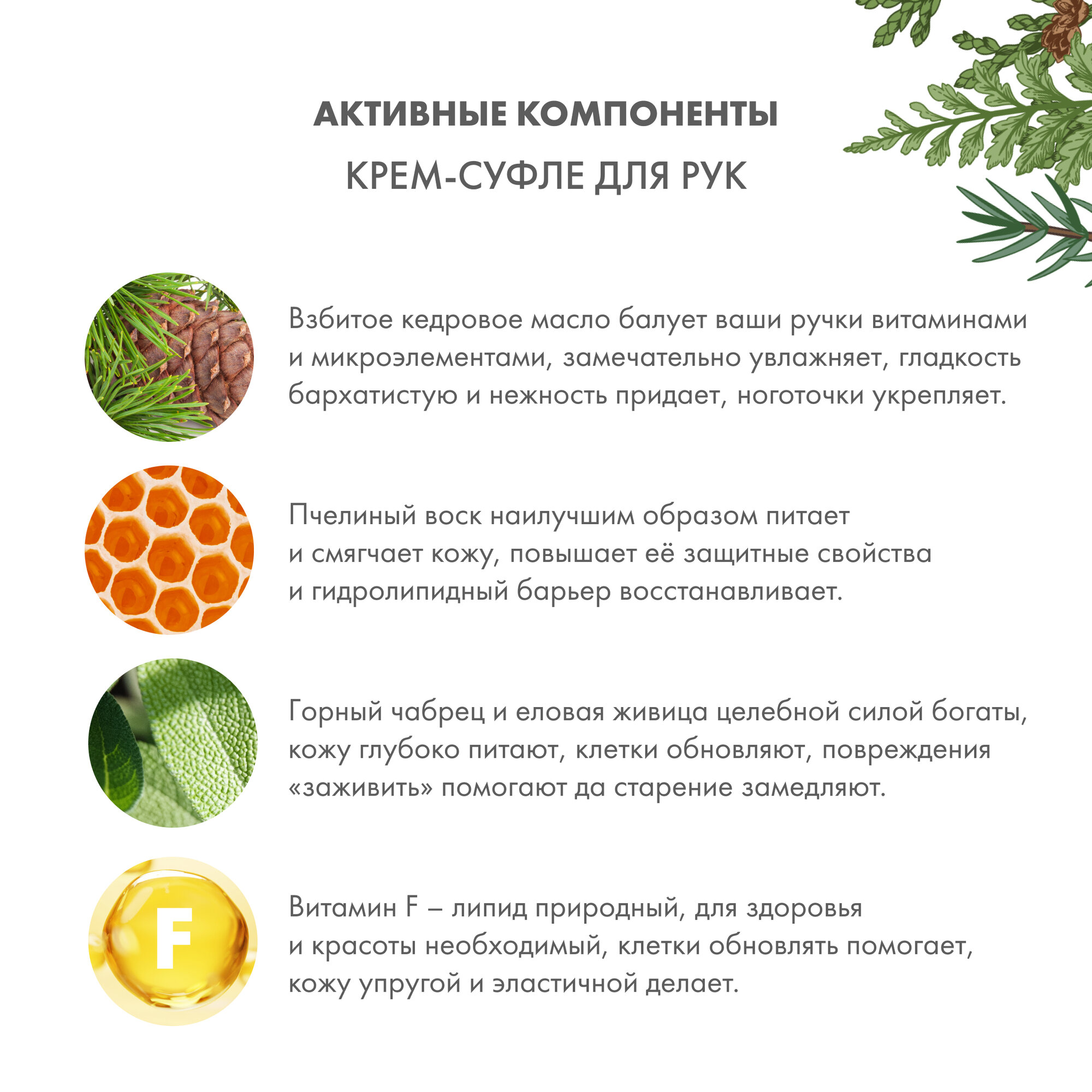 | Состав | Крем-суфле для рук "Питание и защита": Aqua with infusion of Pinus Sibirica Needle Water (гидролат сибирского кедра) / Thymus Serpyllum Leaf Extract (экстракт чабреца) / Picea Abies Wood Tar (живица еловая); Pinus Sibirica Seed Oil (кедровое масло) / Prunus Amygdalus Dulcis Oil / Caprylic/Capric Triglyceride / cetearyl alcohol / Glyceril Stearate / Cera Alba (пчелиный воск) / Linoleic Acid / Oleic Acid / Linolenic Acid (витамин F) / allantoin / Tocopherol (Витамин Е) / Sodium Cetearyl Sulfate / Sodium Carbomer / Xanthan Gum / Benzyl Alcohol / Ethylhexylglycerin / Citric Acid / Parfum / CI 19140. Крем-бальзам для ног "Питание и защита": Aqua with infusion of Pinus Sibirica Needle Water (гидролат сибирского кедра) / Picea Abies Wood Tar (живица еловая) / Abies Sibirica Oil (масло пихты) / Juniperus Communis Wood Oil (масло можжевельника); Pinus Sibirica Seed Oil (кедровое масло) / Urea (мочевина) / Linum Usitatissimum Seed Oil / Ethylhexyl Stearate / cetearyl alcohol / Glyceril Stearate / stearic acid / Panthenol (провитамин В5) / Tocopherol (Витамин Е) / allantoin / Sodium Cetearyl Sulfate / Sodium Carbomer / Xanthan Gum / Benzyl Alcohol / Ethylhexylglycerin / Citric Acid / Parfum / CI 15985 / CI 19140 / ci 42090 / CI 14720. |