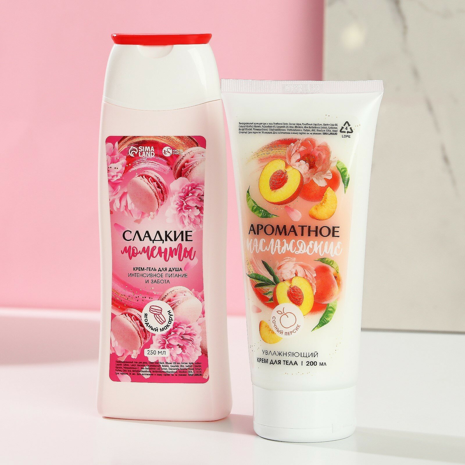 Подарочный набор женский "Двойная сладость", крем-гель для душа 250 мл, аромат ягодный макарун, увлажняющий крем для тела 200 мл, аромат сочный персик интересное: