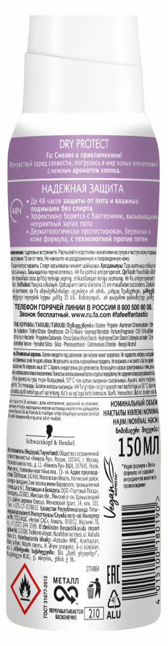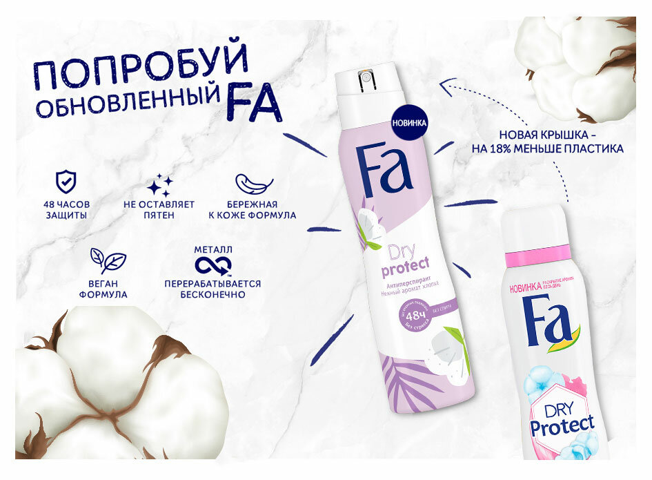 Дезодорант-антиперспирант спрей женский ФА Сухая защита Нежность хлопка, 150мл, Россия