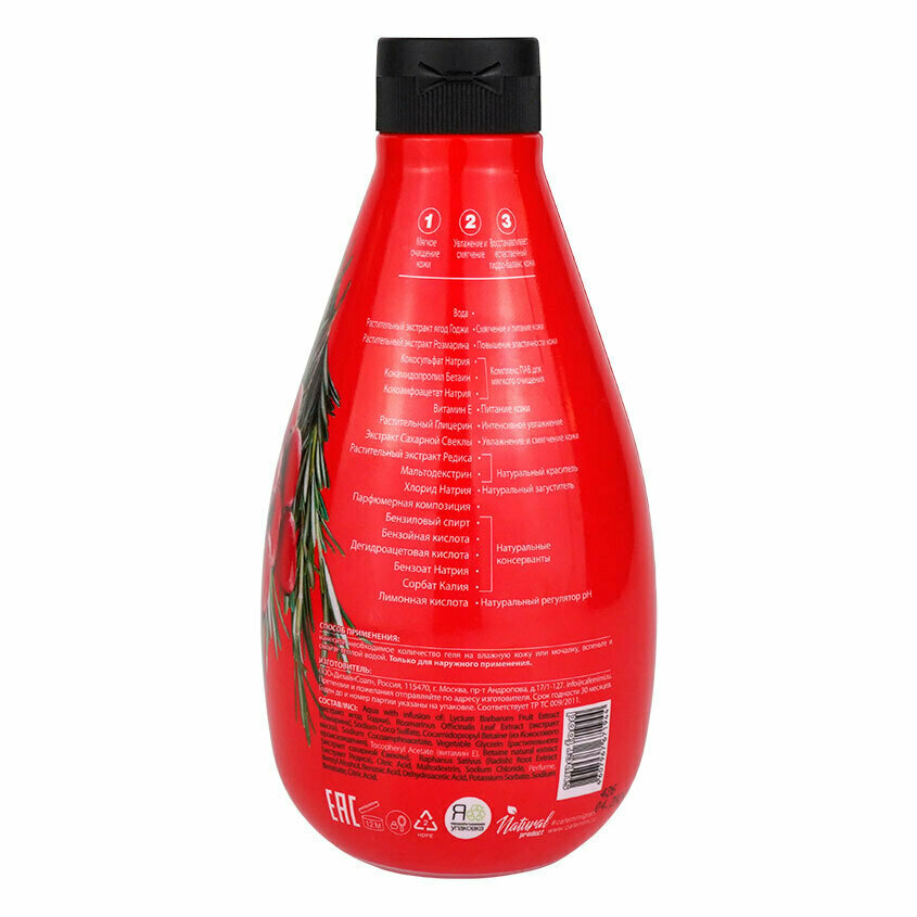 | Состав | Aqua with infusion of: Lycium Chinense Fruit Extract (экстракт ягод Годжи), Rosmarinus Officinalis Leaf Extract (экстракт Розмарина), Sodium Coco Sulfate, Cocamidopropyl Betaine (из Кокосового масла), Sodium Cocoamphoacetate, Vegetable Glycerin (растительного происхождения), Tocopheryl Acetate (витамин Е), Betaine Natural Extract (экстракт сахарной Свеклы), Raphanus Sativus (Radish) Root Extract (экстракт Редиса), Citric Acid, Maltodextrin, Sodium Chloride, Parfume, Benzyl Alcohol, Benzoic Acid, Dehydroacetic Acid, Potassium Sorbate, Sodium Benzoate. |