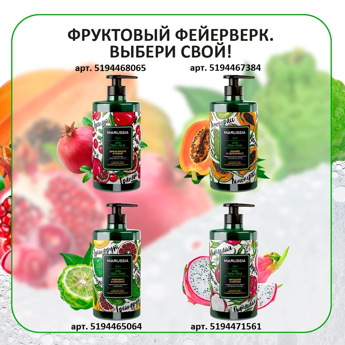 | Аромат | абрикос / ананас / вишня / гранат / грейпфрут / грейпфрут и бергамот / дыня / лайм / манго / папайя / лемонграсс / питахайя / нероли / тропический коктейль |