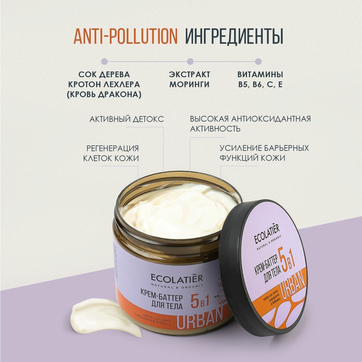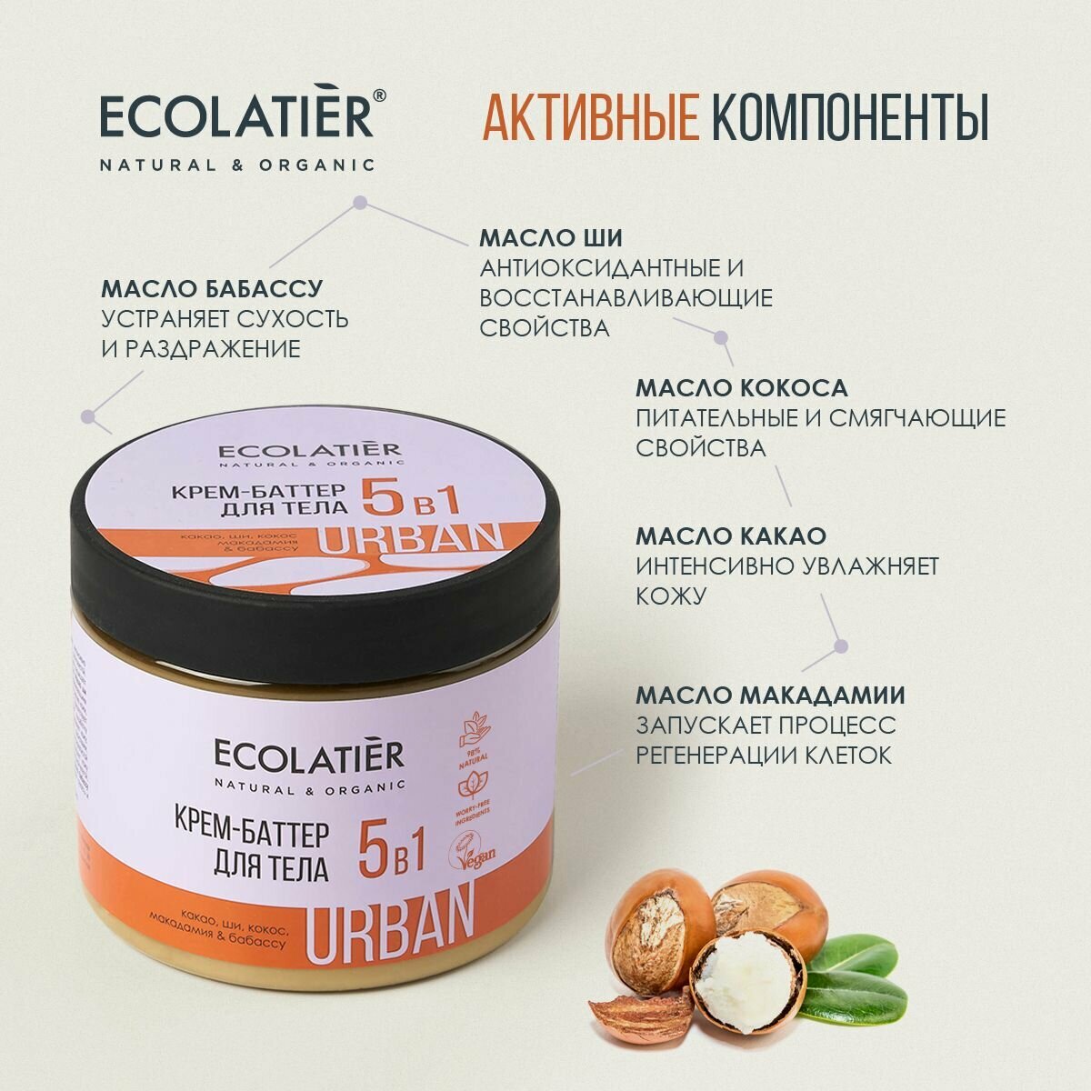 ECOLATIER / Крем баттер для тела 5 в 1 какао, ши, кокос, макадамия, бабассу / 380 мл интересное: