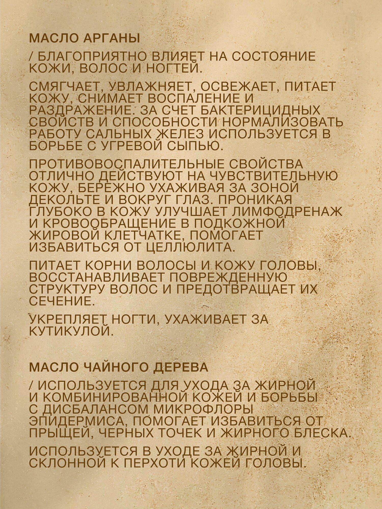 | Состав | оливковое масло, парфюм, циклометикон, витамин E, масло арганы, масло чайного дерева, молекулярное масло |