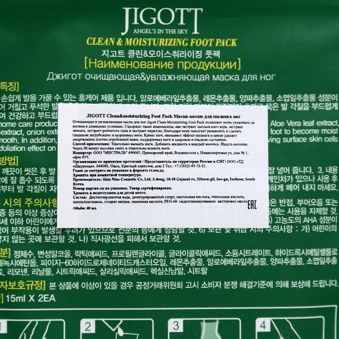 | Способ применения | тщательно вымойте ноги и наденьте тканевую маску. Тщательно распределите раствор из пакетика по нижней внутренней части тканевой маски. Подождите пока содержимое хорошо впитается в стопы (рекомендуемое время - 90 мин.). Тщательно вымойте ноги. Имеются индивидуальные различия, но обычно ороговевшие клетки кожи ног начинают отшелушиваться естественным образом через 4-6 дней после использования. В период отшелушивания не удаляйте ороговевшие клетки кожи ног принудительно. |