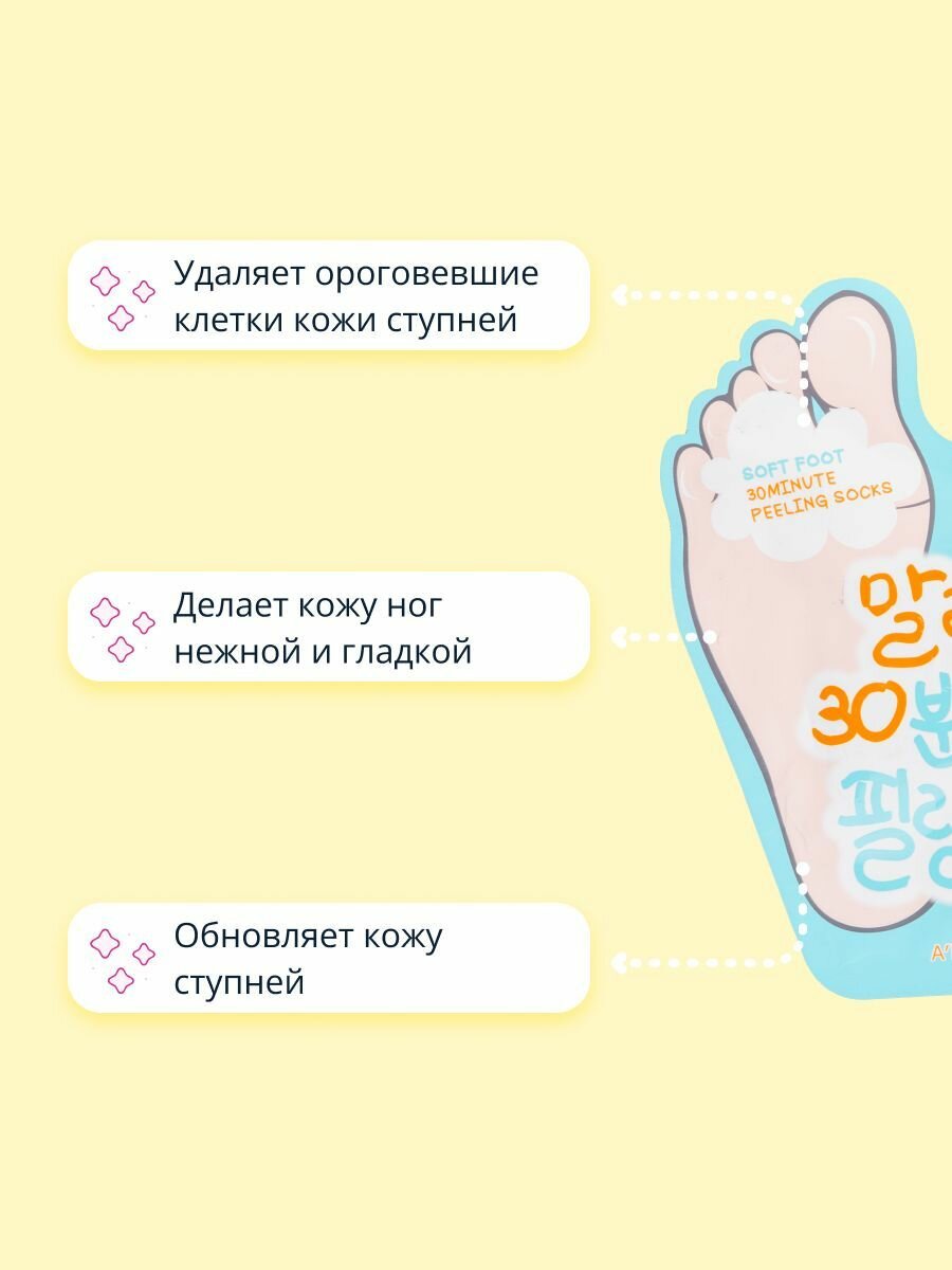 | Способ применения | хорошо вымойте и высушите ноги, наденьте носочки на 30 мин, затем тщательно вымойте ноги. Шелушение начнется через 4-6 дней |