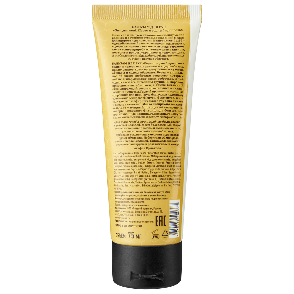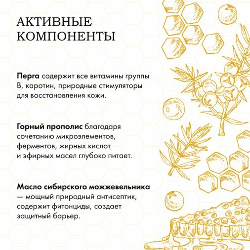 | Cостав | Hypericum Perforatum Flower Water (настой соцветий зверобоя) with infusions of Mel (гречишный мёд, липовый мёд, кедровый мёд, акациевый мёд, донниковый мёд, кипрейный мёд, дягилевый мёд), Pollen Extract (перга), Propolis Extract (экстракт горного прополиса), Juniperus Communis Wood Oil (масло можжевельника), Caprylic/Capric Triglyceride, Triticum Vulgare Germ Oil, Butyrospermum Parkii Butter, Dicaprylyl Ether, Isododecane, Cetearyl Alcohol, Glyceril Stearate, Stearic Acid, Glycerin, Panthenol (провитамин В5), Tocopherol (витамин Е), Bisabolol (бисаболол), Saccharide Isomerate, Sodium Hyaluronate, Sodium Cetearyl Sulfate, Citric Acid, Benzyl Alcohol, Ethylhexylglycerin, Parfum, CI 15985, CI 19140. |