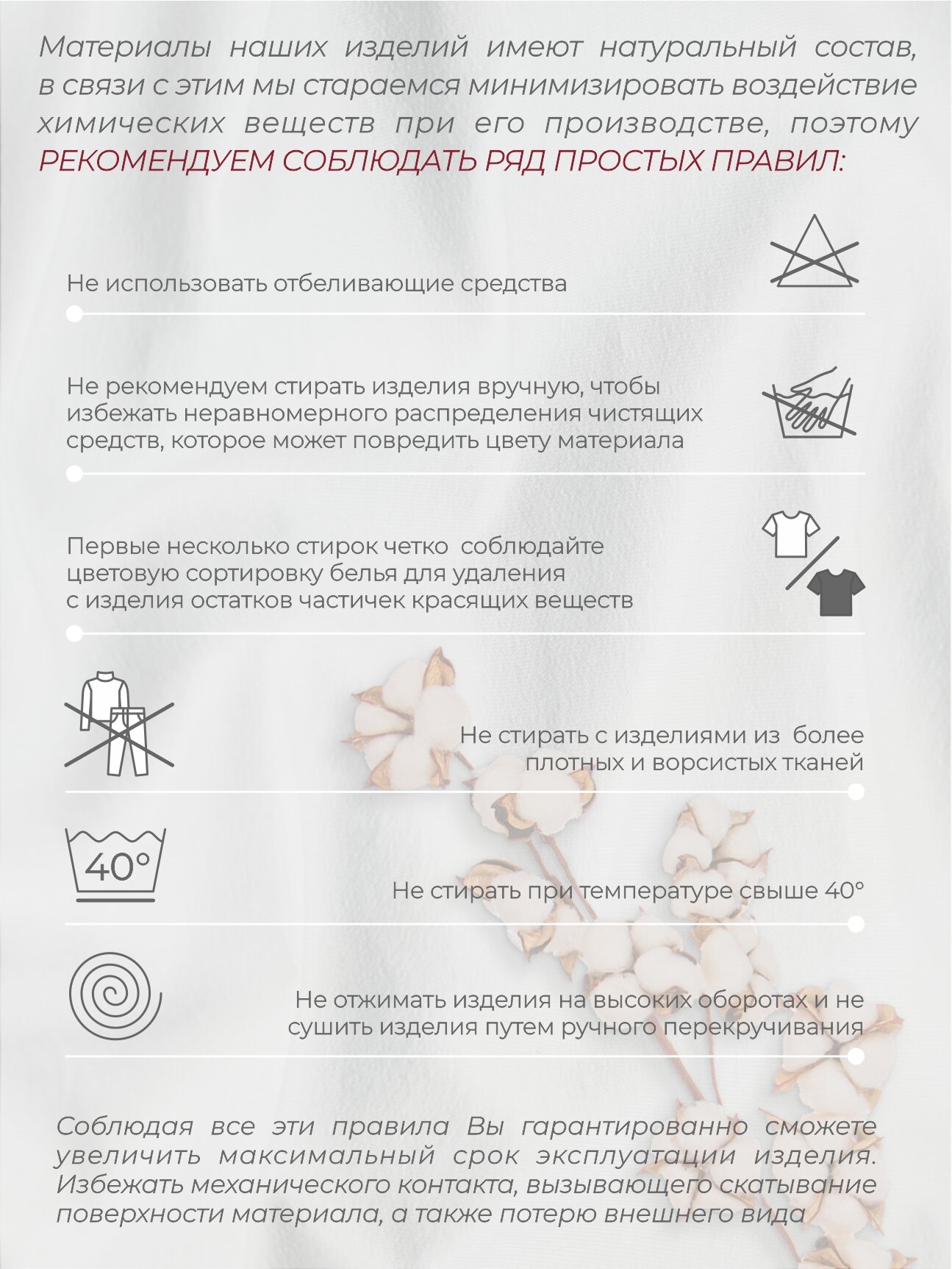 | Дополнительная информация | деликатная машинная ручная стирка до 30 градусов не отбеливать не сушить при высоких оборотах |