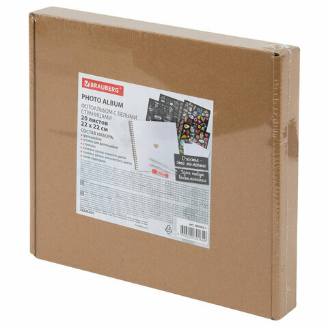 Купить Фотоальбом 22х22 см, 20 белых листов, уголки, стикеры, ручки, клей, BRAUBERG White Line, 880651