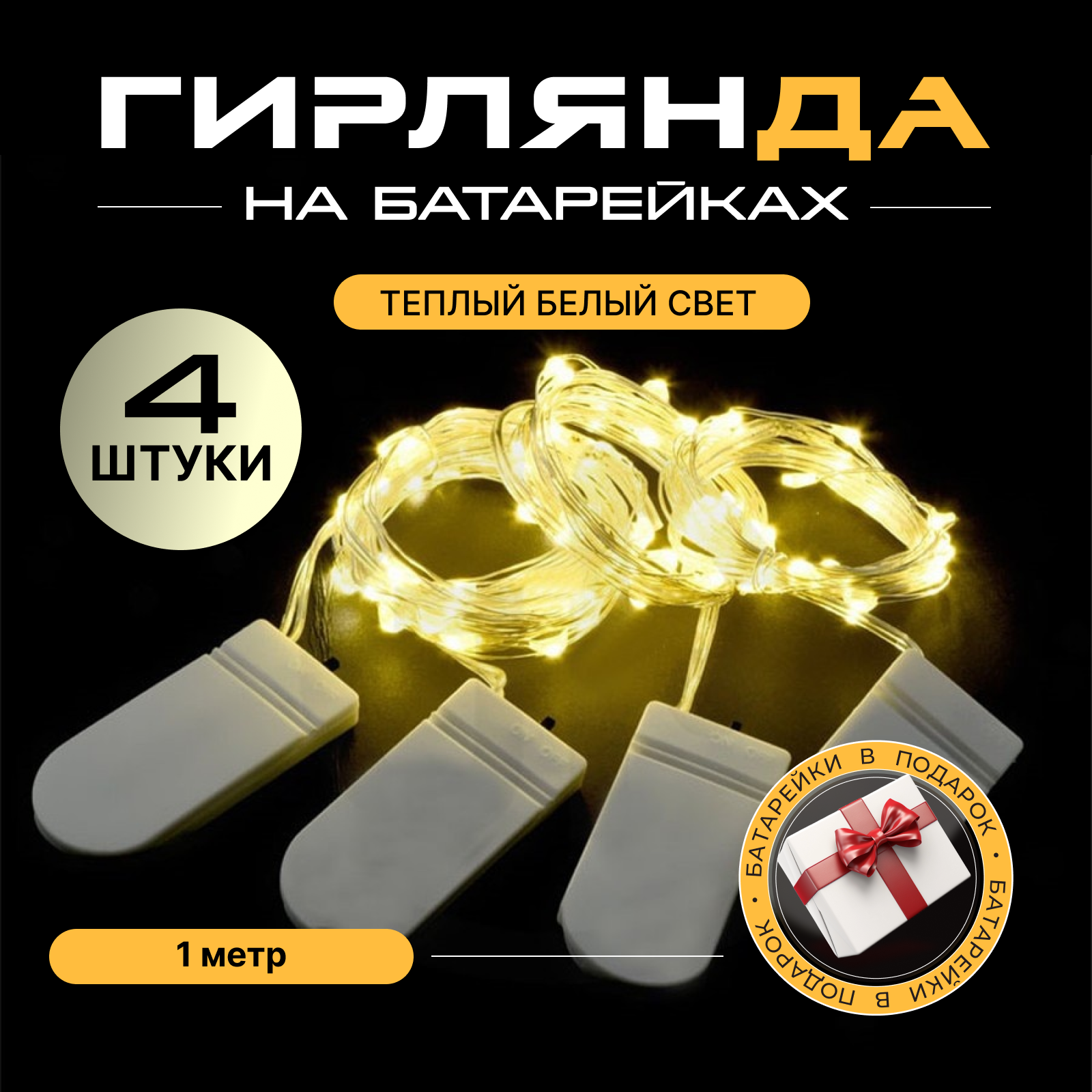 Купить FamilyLove Гирлянда новогодняя на батарейках светодиодная теплый белый свет, 1м, 4 штуки