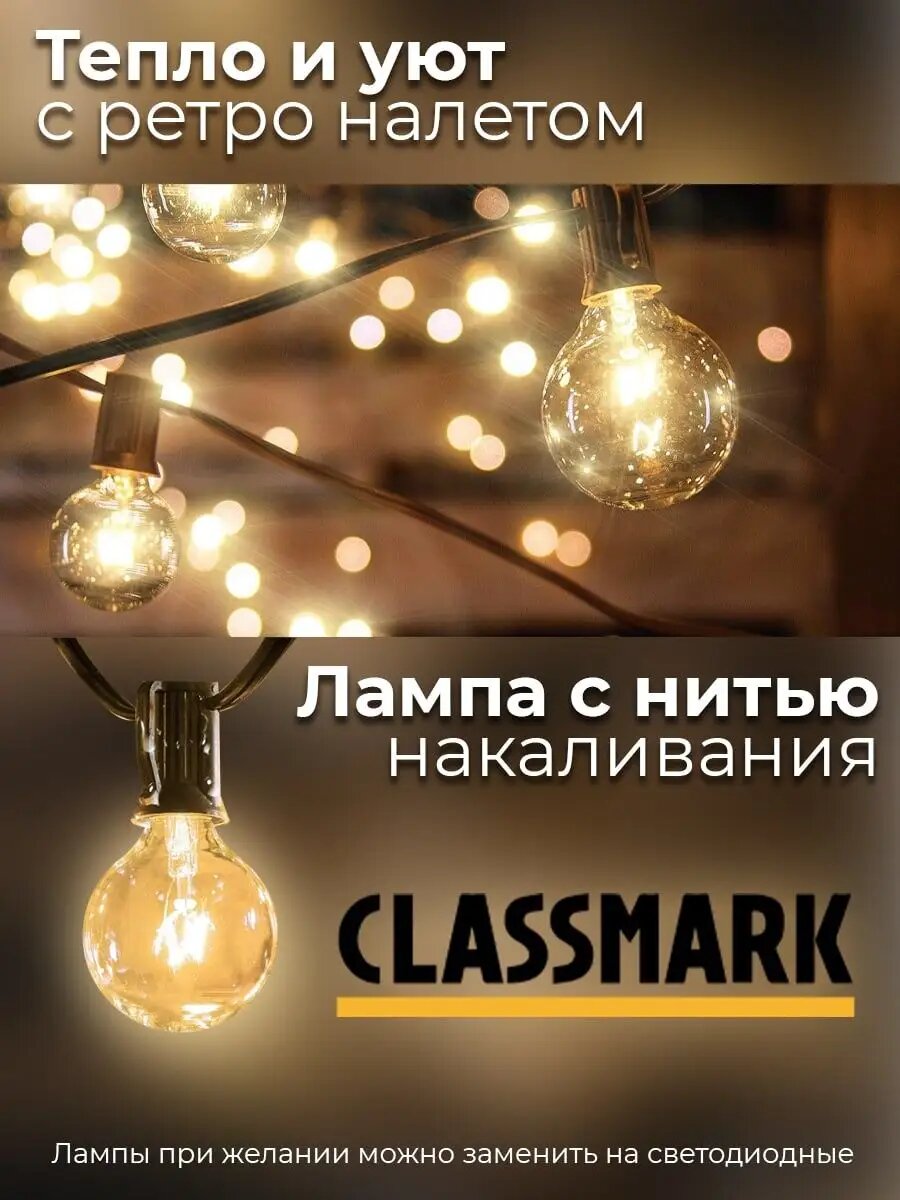 Электрогирлянда уличная ретро винтаж 15 м Classmark, садовая гирлянда на 50 ламп накаливания, теплый желтый свет, питание От сети 220В, 1 шт