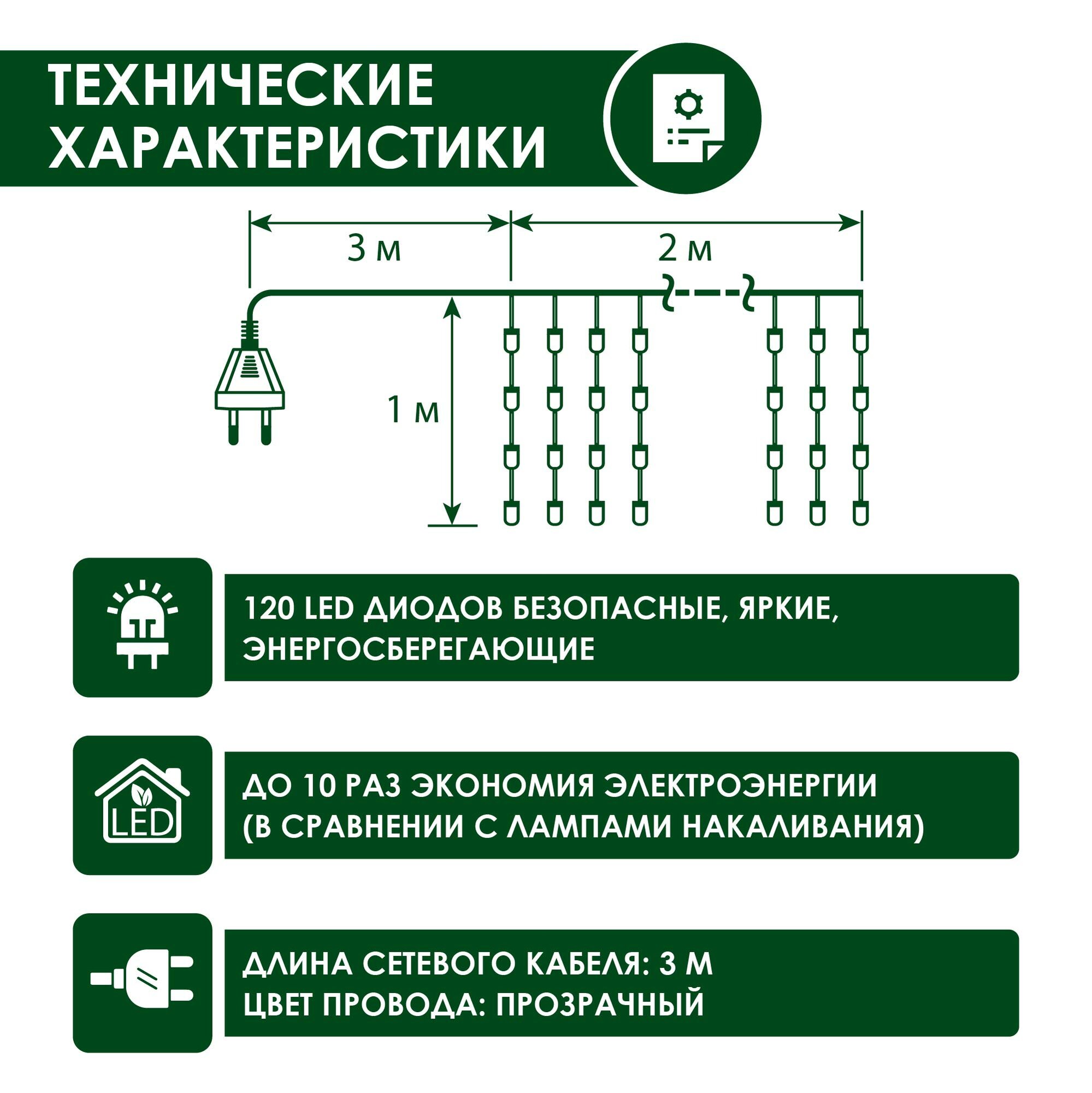 Электрогирлянда Световой занавес, 2 м х 1 м, 120 тёплых белых матовых светодиодов, для использования внутри помещений
