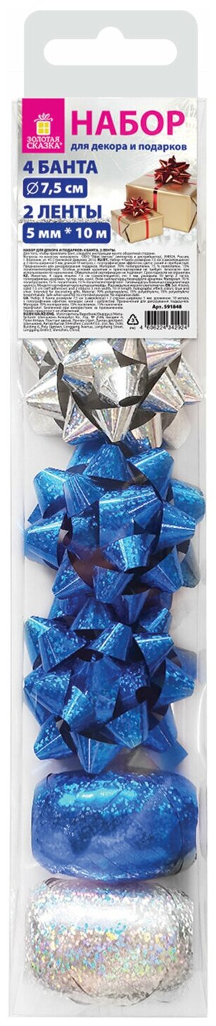 Набор для декора и подарков 4 банта, 2 ленты, металлик, цвета: синий, красный, золотая сказка, 591846