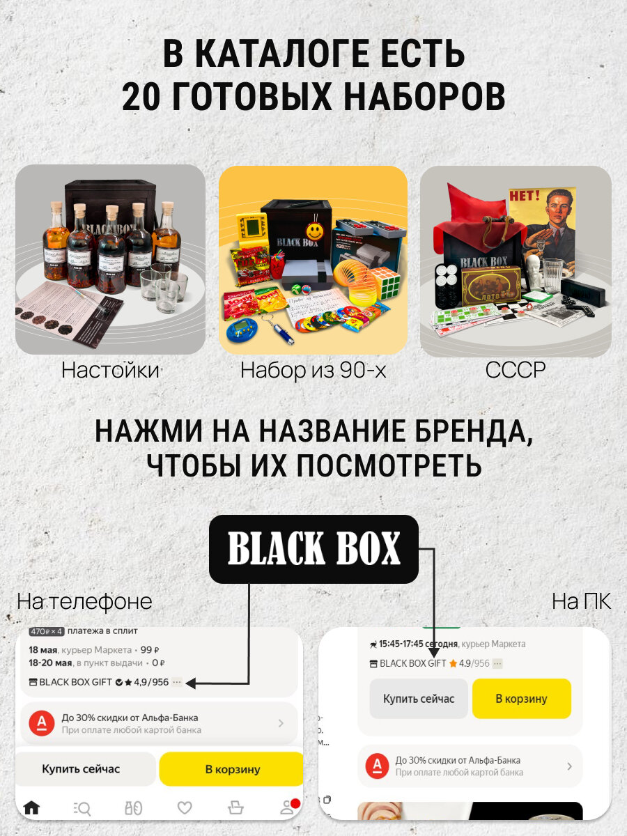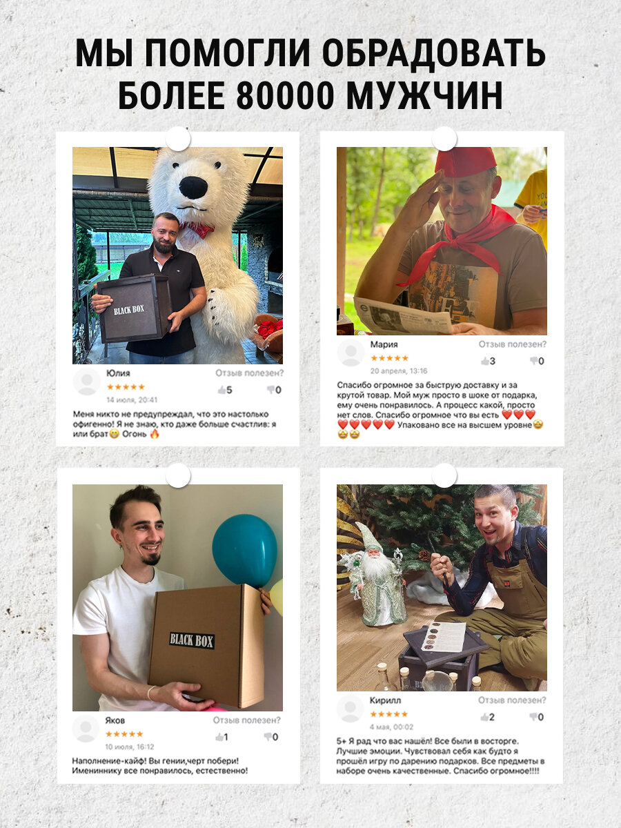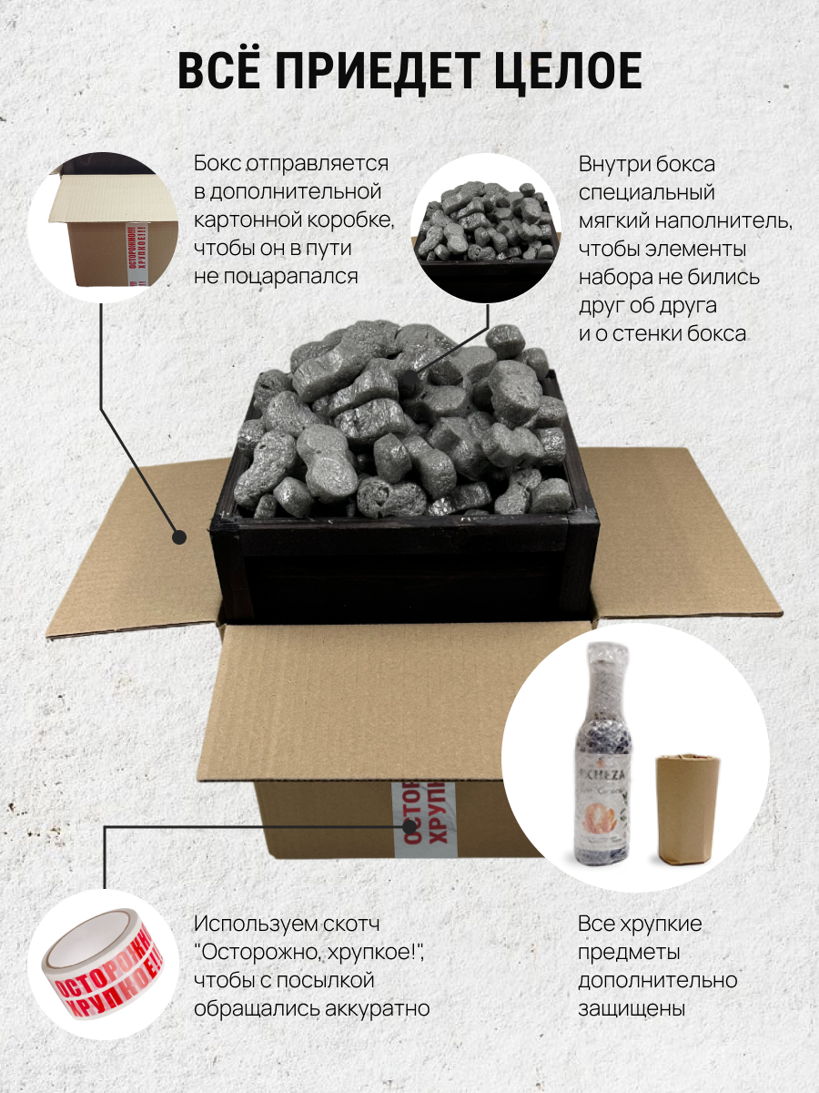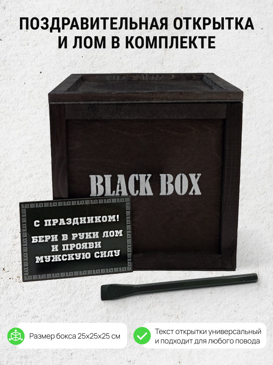 | Комплектация | 1. Деревянный ящик с логотипом Black Box 2. Наполнитель 3. Лом-гвоздодер 4. Гвозди 5. Поздравительная открытка Black Box. |