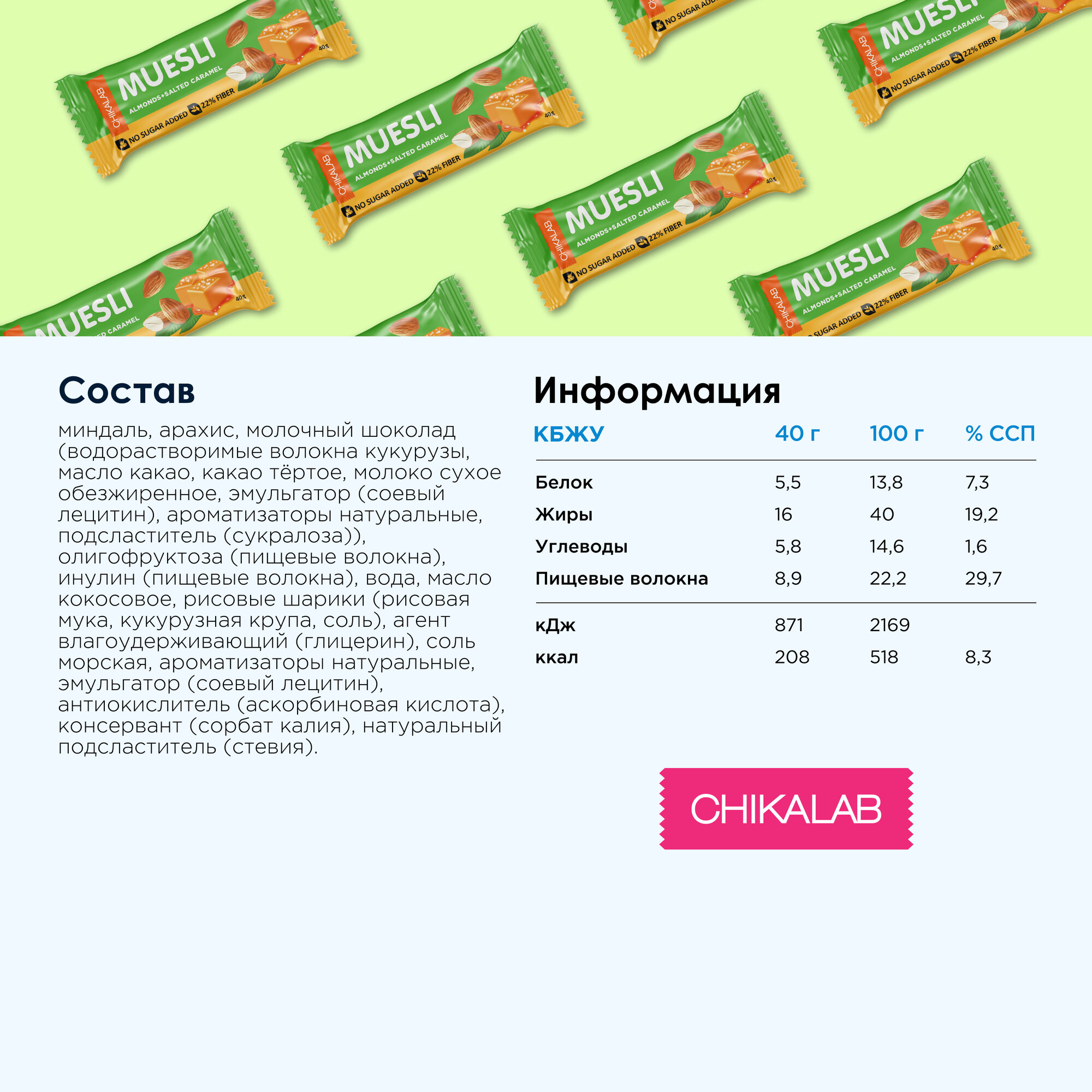 CHIKALAB Батончики мюсли ореховые в шоколаде без сахара "Миндаль и соленая карамель", 12шт х 40г интересное: