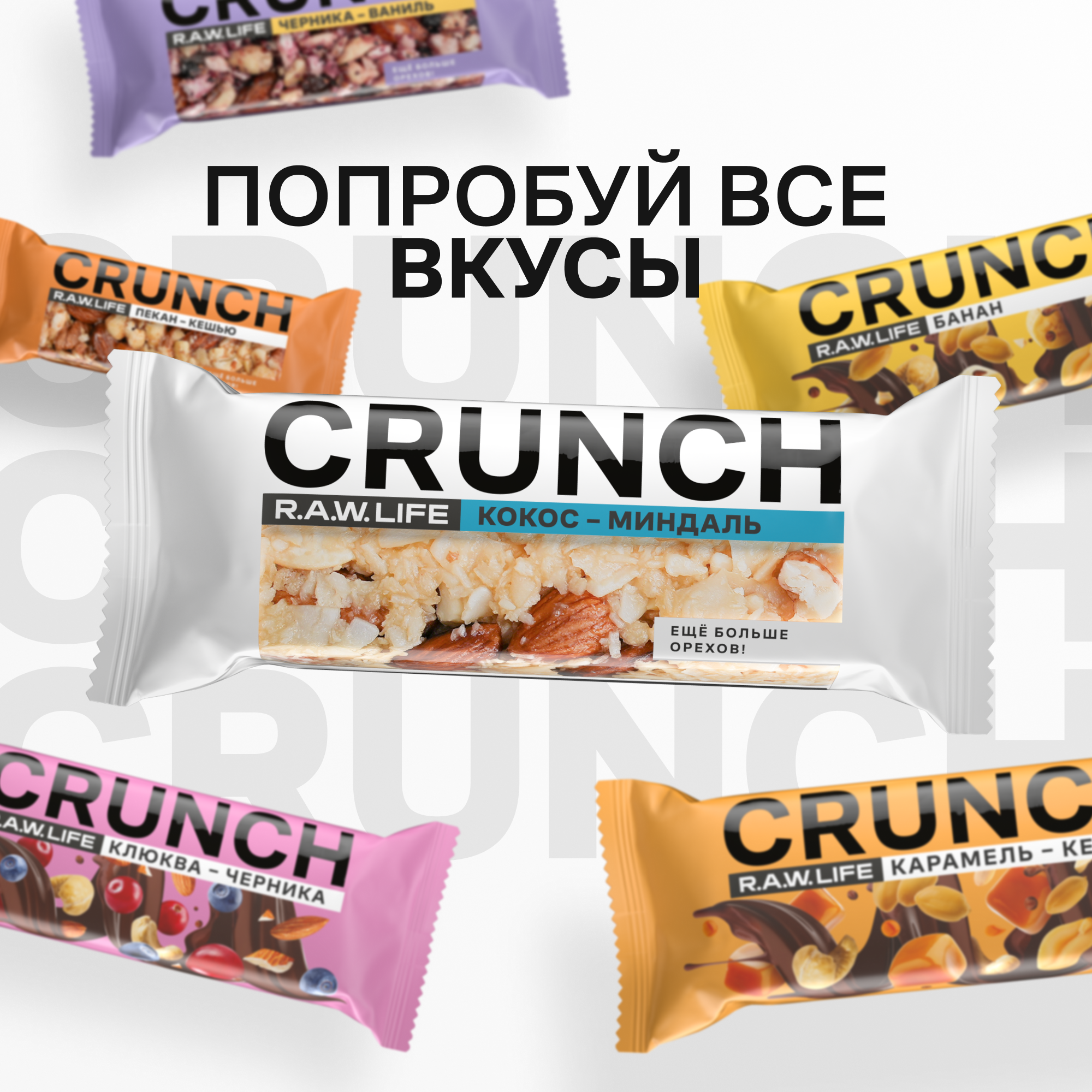 Энергетические батончики без сахара R.A.W.LIFE CRUNCH / Злаковые, натуральные, много орехов / Кокос-миндаль 12 шт по 30 гр интересное: