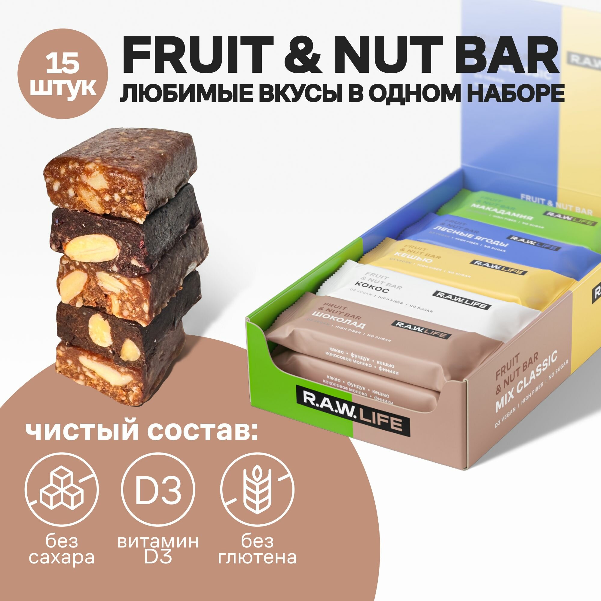 Батончики R.A.W.LIFE Fruit&Nut Bar / Фруктово-ореховый ассорти набор полезного пп перекуса без сахара и глютена / MIX Classic 5 вкусов 15 шт по 47 гр