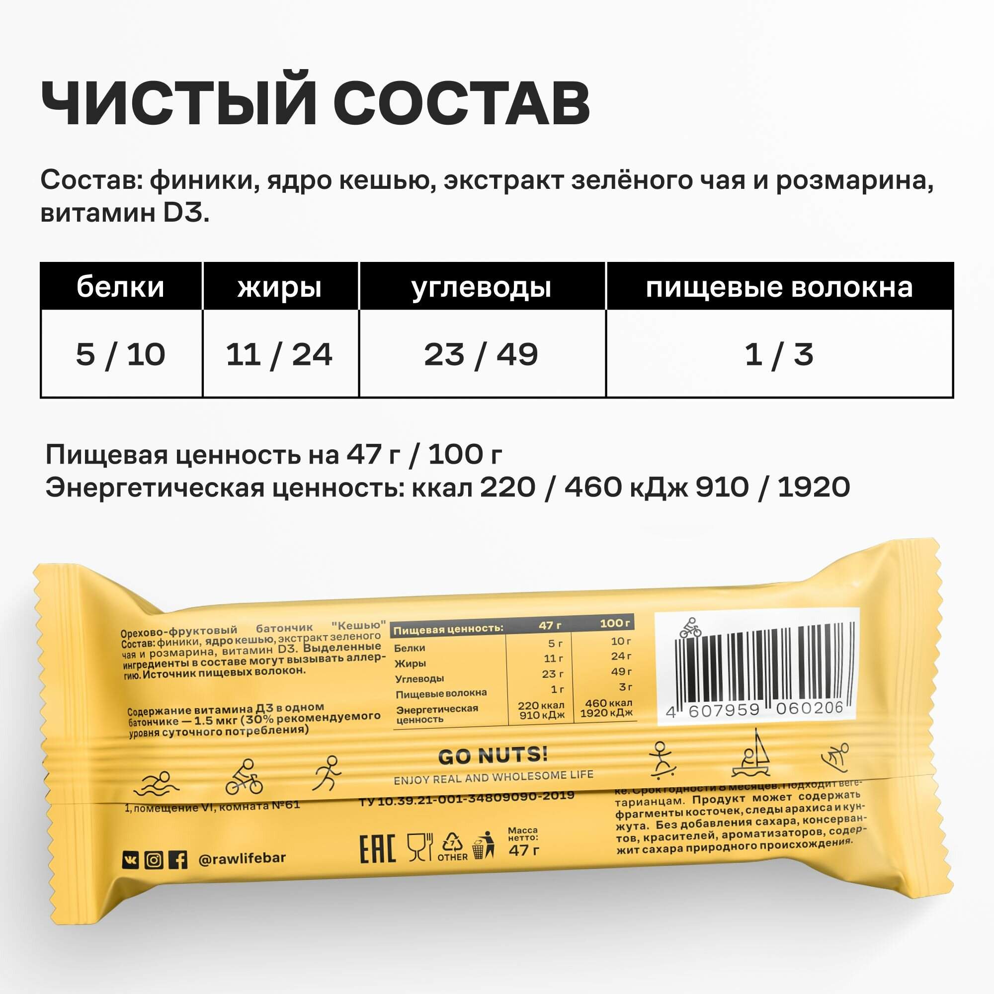 Батончики R.A.W.LIFE Fruit&Nut Bar / Фруктово-ореховый бокс полезных пп сладостей без сахара, лактозы и глютена / Кешью 15 шт по 47 гр