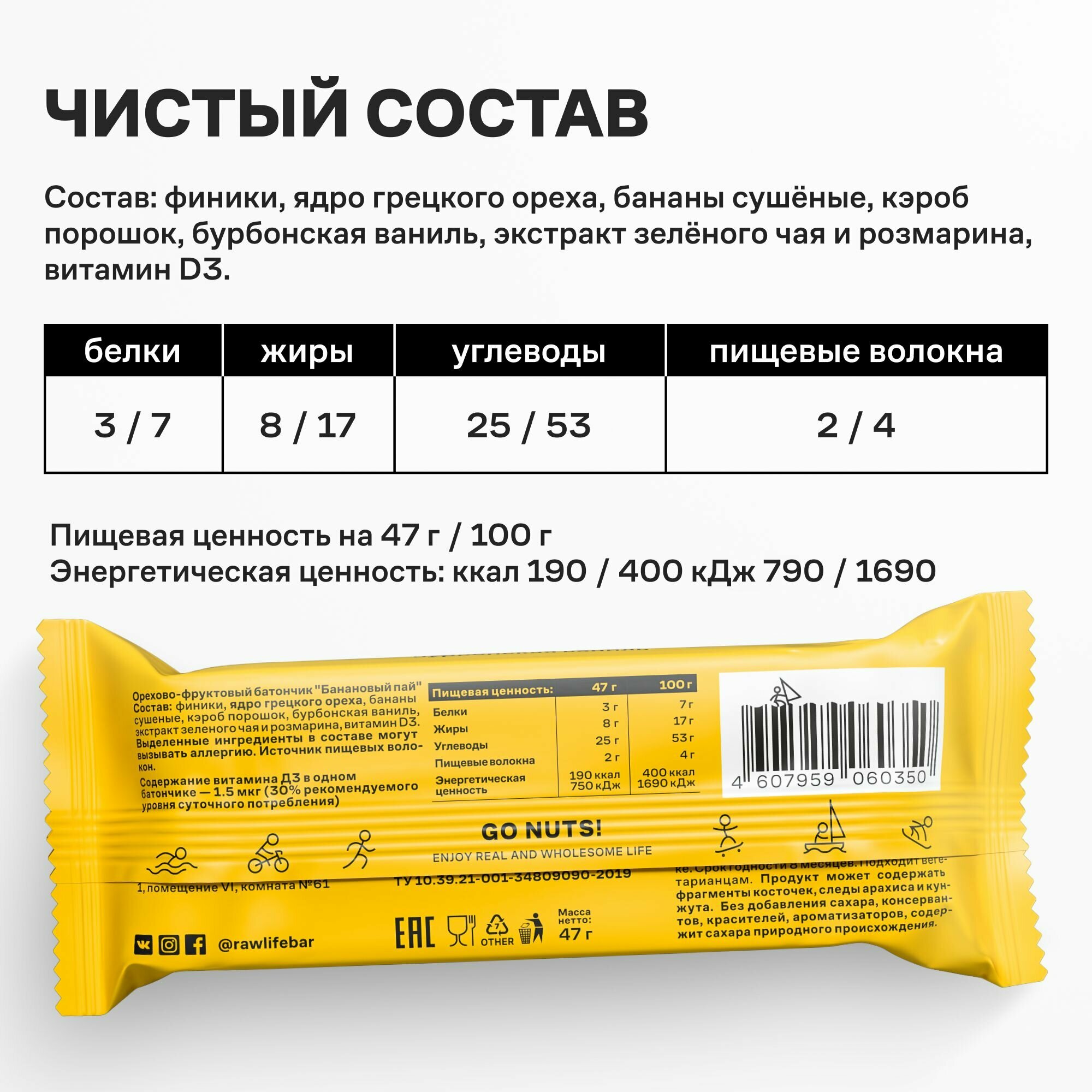 Батончики фруктово-ореховые R.A.W.LIFE без сахара и глютена - Банановый пай 15шт х 47гр