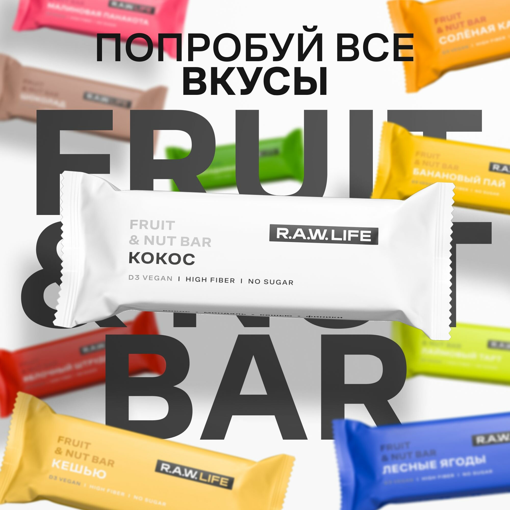 Батончики R.A.W.LIFE Fruit&Nut Bar / Набор полезных пп сладостей орехово-фруктовых без сахара, лактозы и глютена / Кокос 3 шт по 47г
