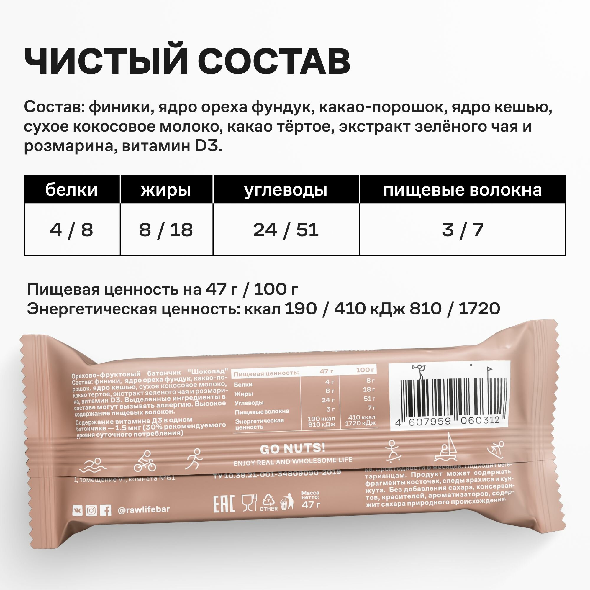 | Дополнительная информация | 10 батончиков в ассортименте: кокос, пекан, какао-мята, кешью, макадамия, лайм-имбирь, малина-лайм, лесные ягоды, грецкий орех-кэроб, те гуань инь |
