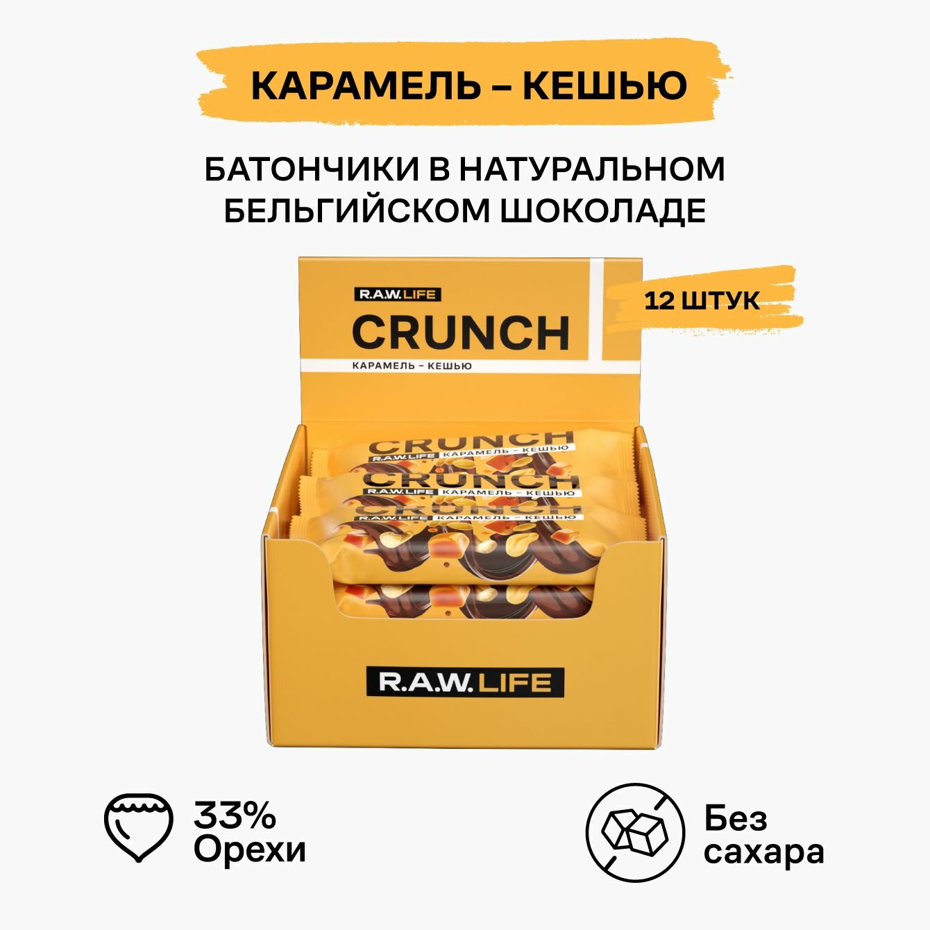 СохранитьЭнергетические батончики без сахара R.A.W.LIFE CRUNCH с бельгийским шоколадом / Злаковые, натуральные, много орехов / Карамель-Кешью 12 шт по 40 гр интересное: