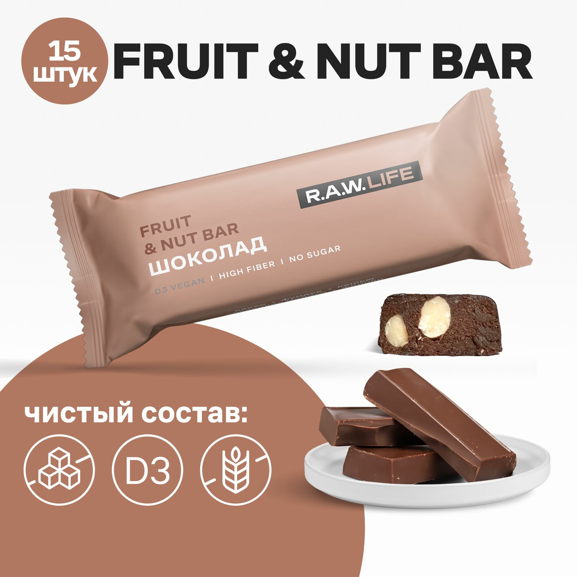 Купить Батончики R.A.W.LIFE Fruit&Nut Bar / Фруктово-ореховый бокс полезных пп сладостей без сахара, лактозы и глютена / Шоколад 15 шт по 47 гр