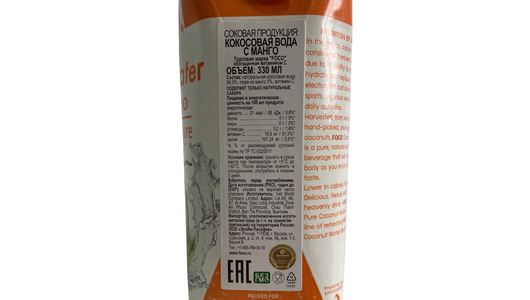 | Состав | натуральная кокосовая вода 94,9%, пюре манго 5%, витамин С |