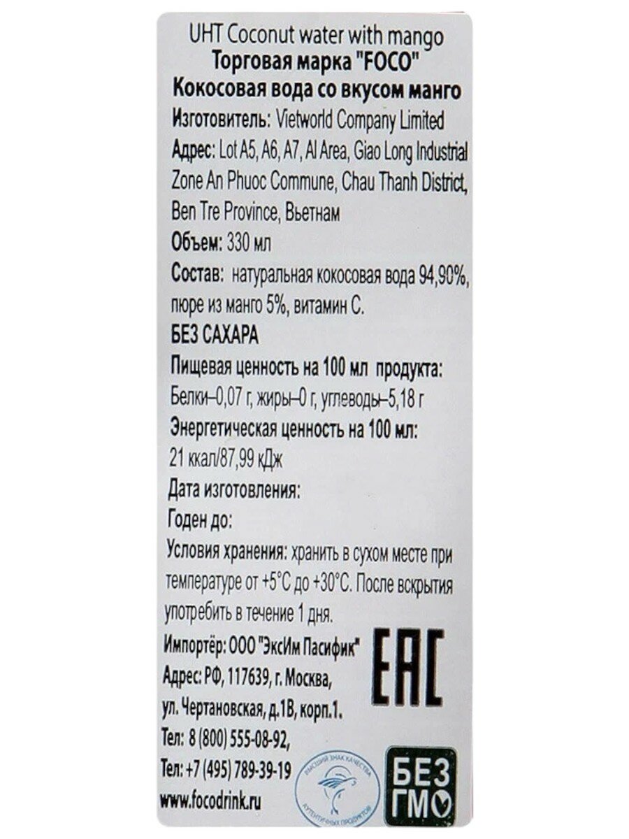 | Состав | натуральная кокосовая вода 94,9%, пюре манго 5%, витамин С |