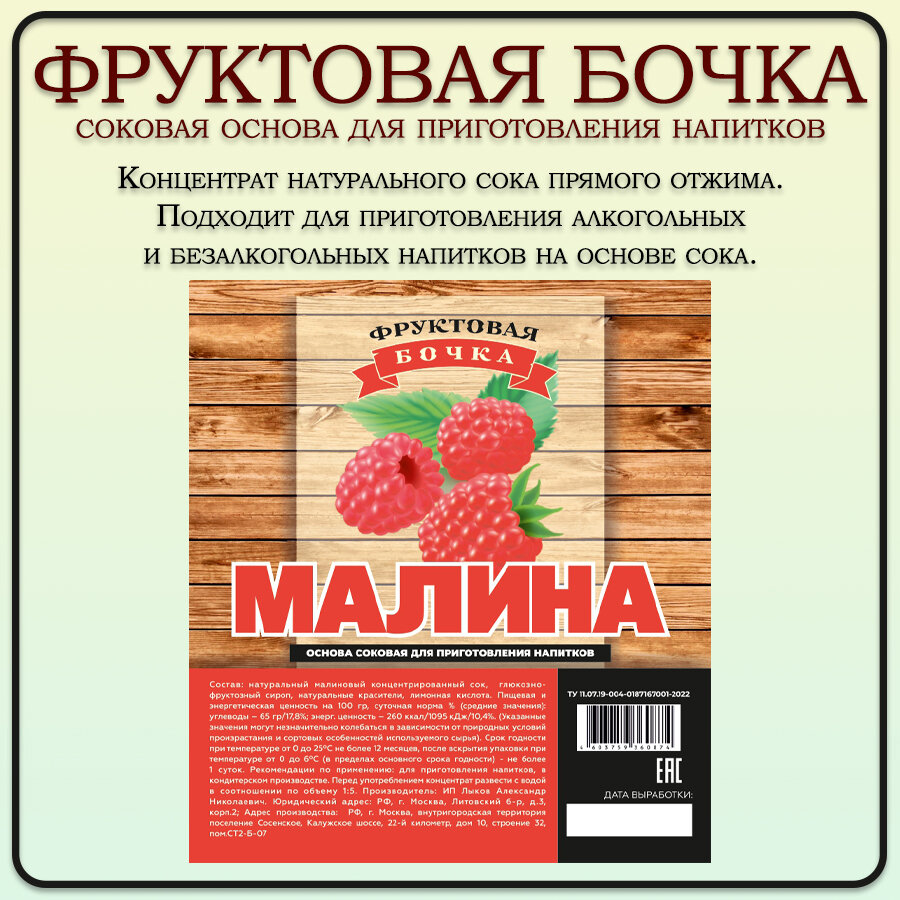 | Состав | Натуральный концентрированный малиновый сок, глюкозно-фруктозный сироп, натуральные красители, лимонная кислота. |