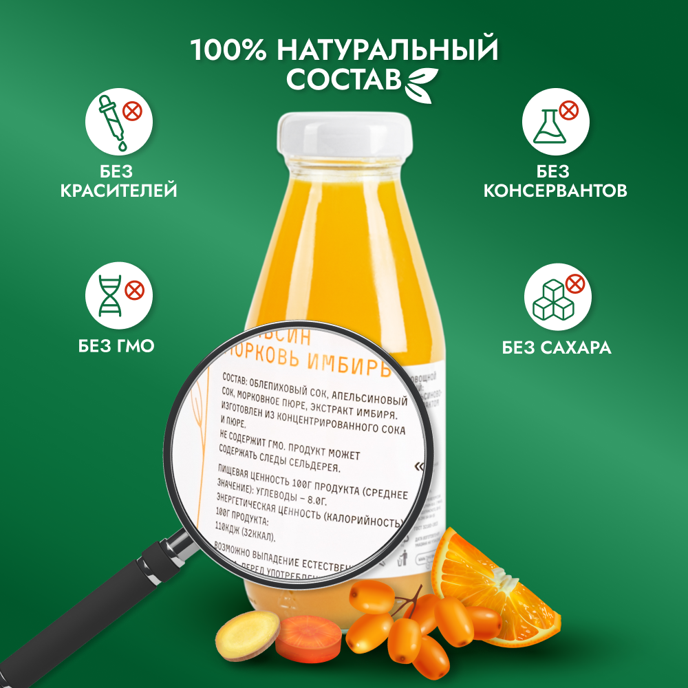 | Состав | Облепиха , апельсин , морковь , имбирь |